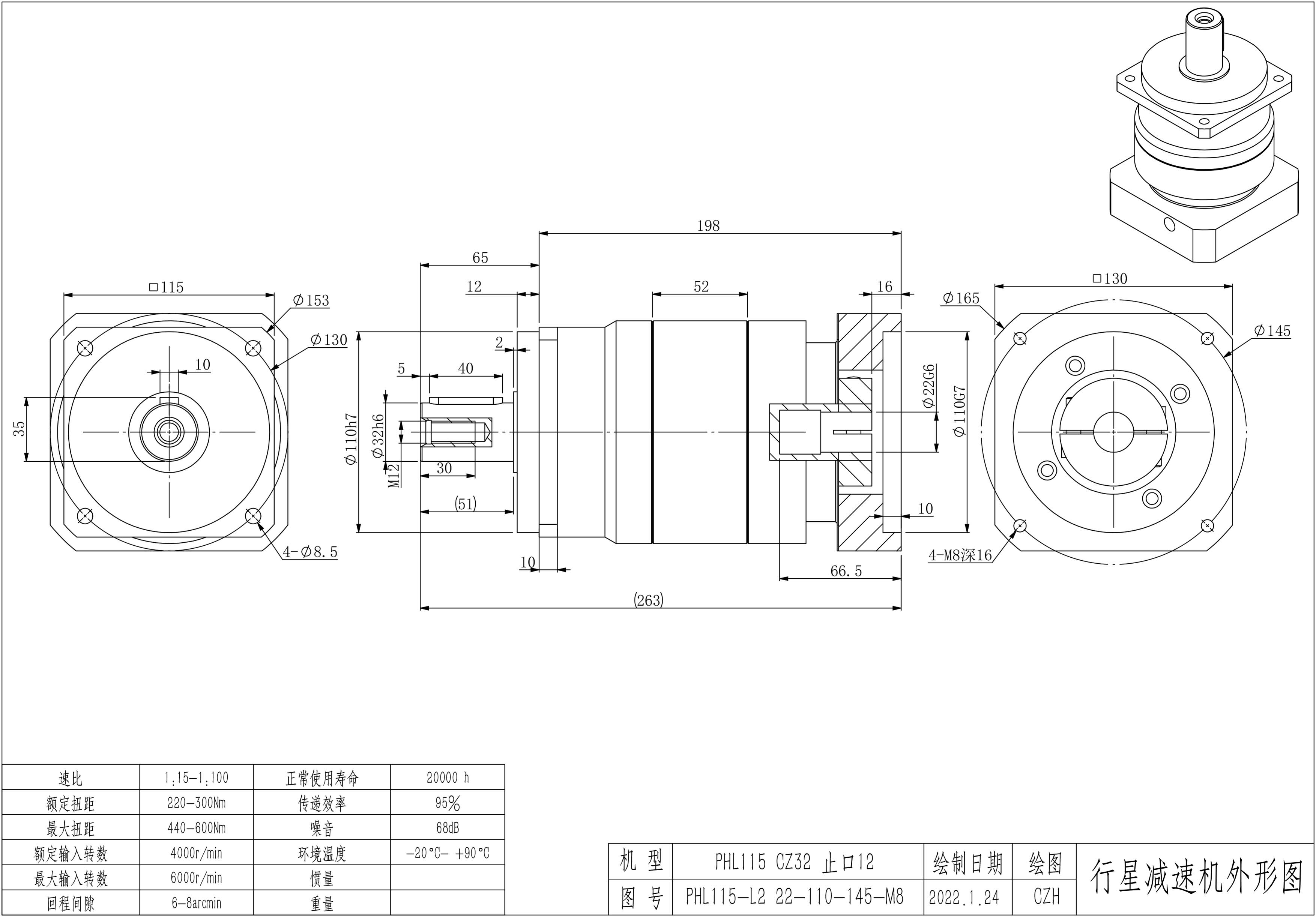 KB系列伺服行星减速机PHL115-L2 22-110-145-M8 CZ32 止口12