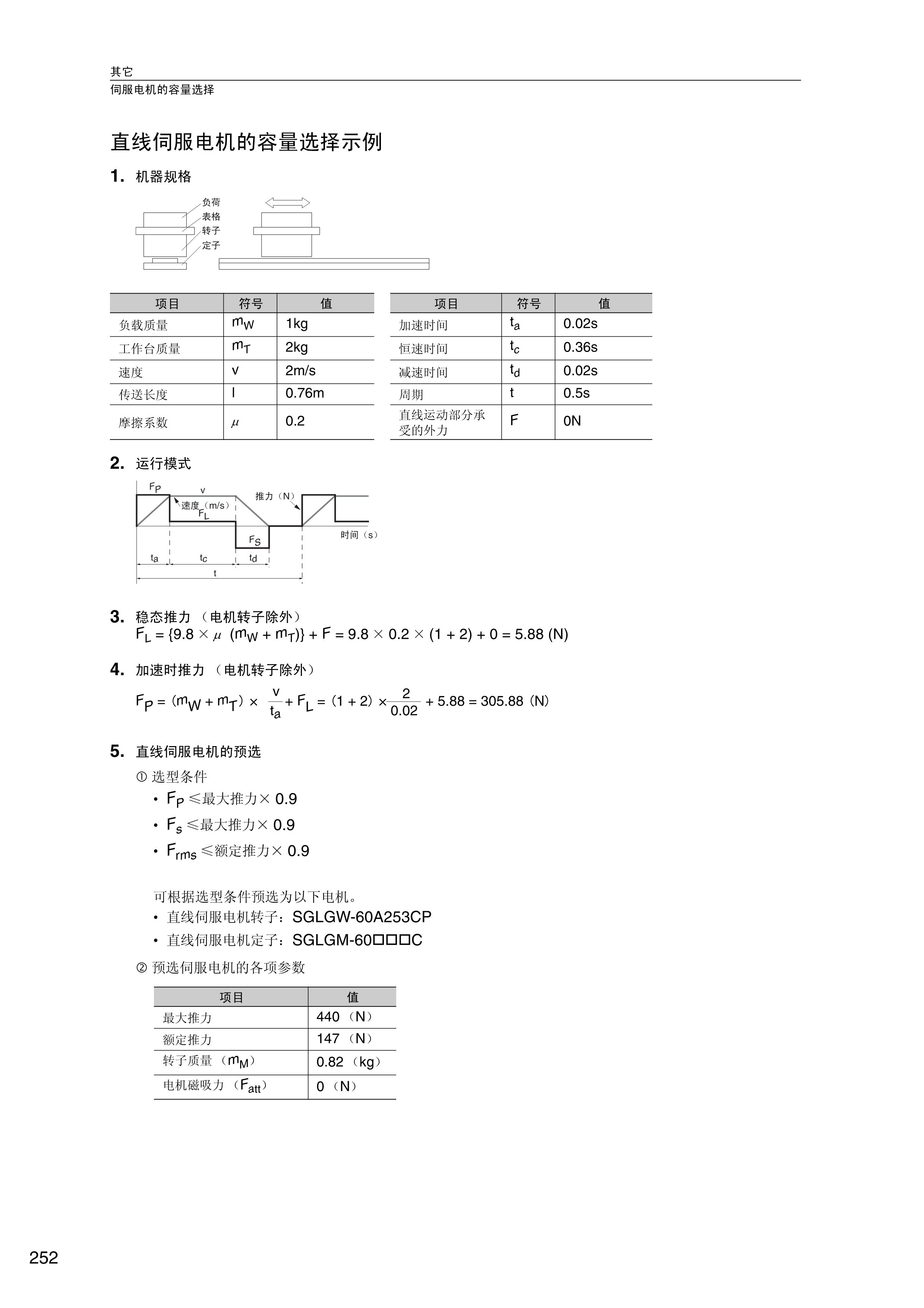FX安川伺服电机 直线伺服电机的容量选择示例;1,机器规格 2,运行模式 3,稳态推力【电机转子除外】 4,加速时推力【电机转子除外】 5,直线伺服电机的预选