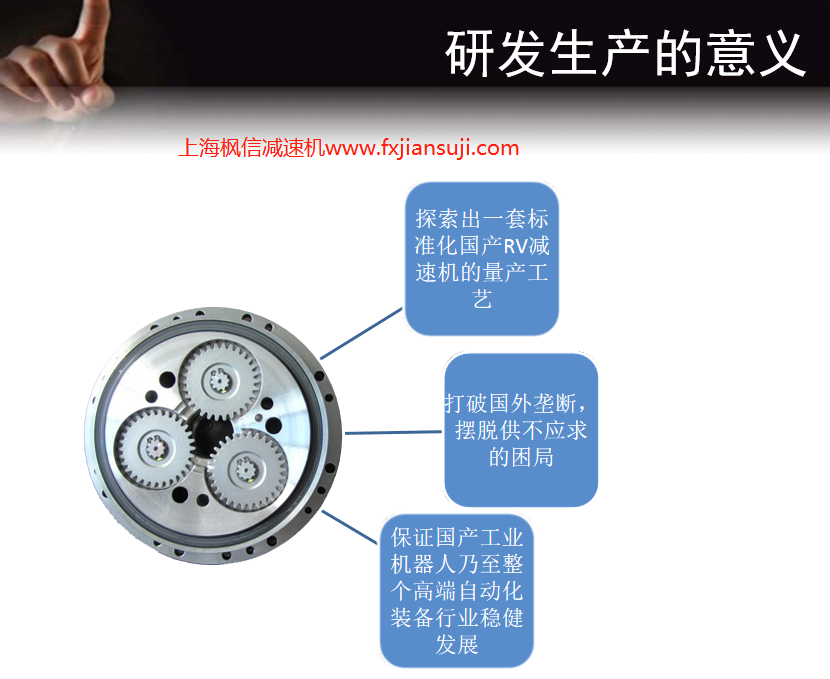 相较于传统谐波传动的减速器,RV减速器疲劳强度大、刚度强、寿命长、而且回差精度稳定,不像谐波传动那样随着使用时间增长运动精度就会显著降低,所以世界上许多国家的高精度机器人传动多采用RV减速器。就目前而言,RV减速器在先进机器人传动中有着逐渐取代谐波减速器的发展趋势。