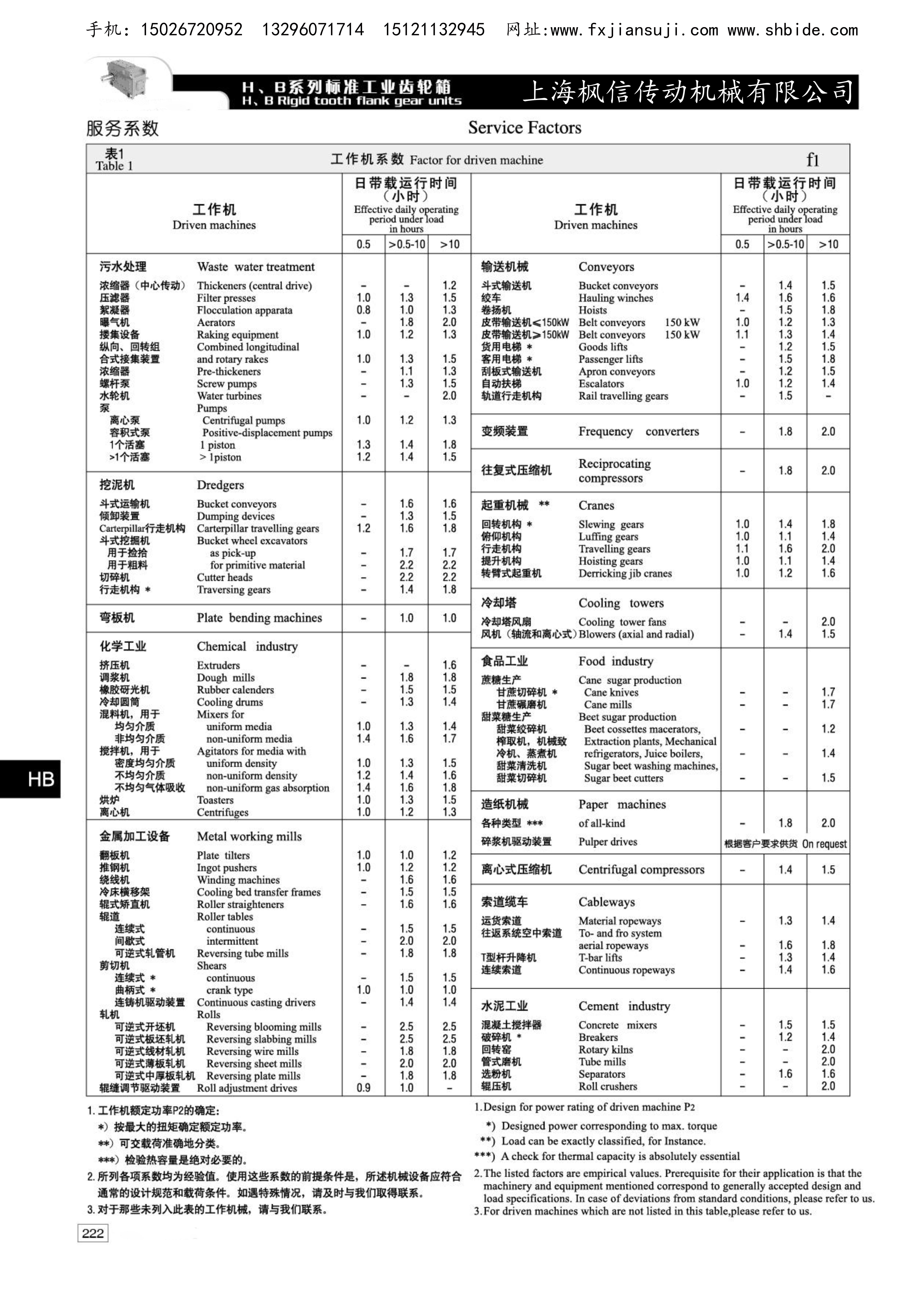 - FXHB减速器 Gear Units 服务系数 Service Factor