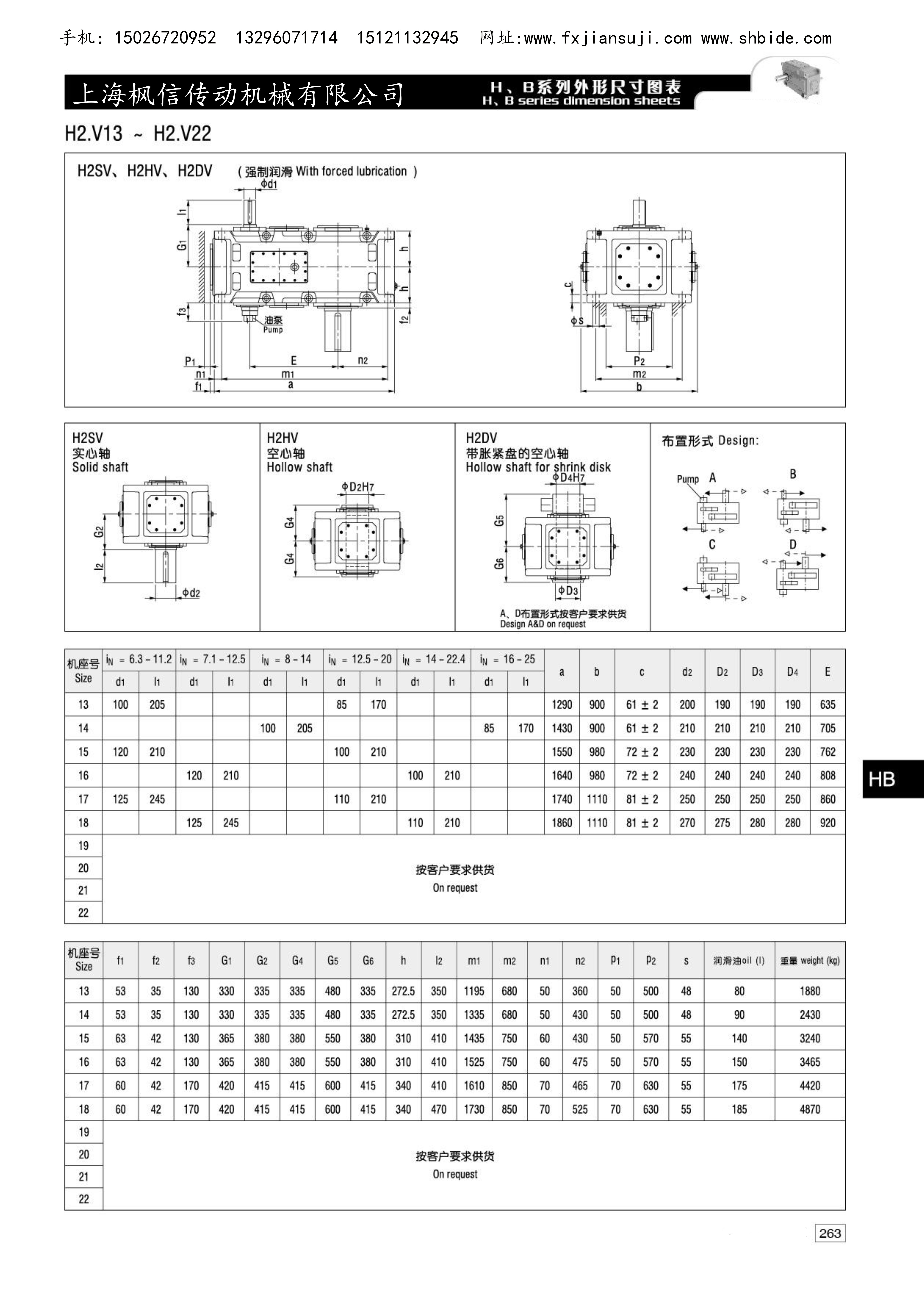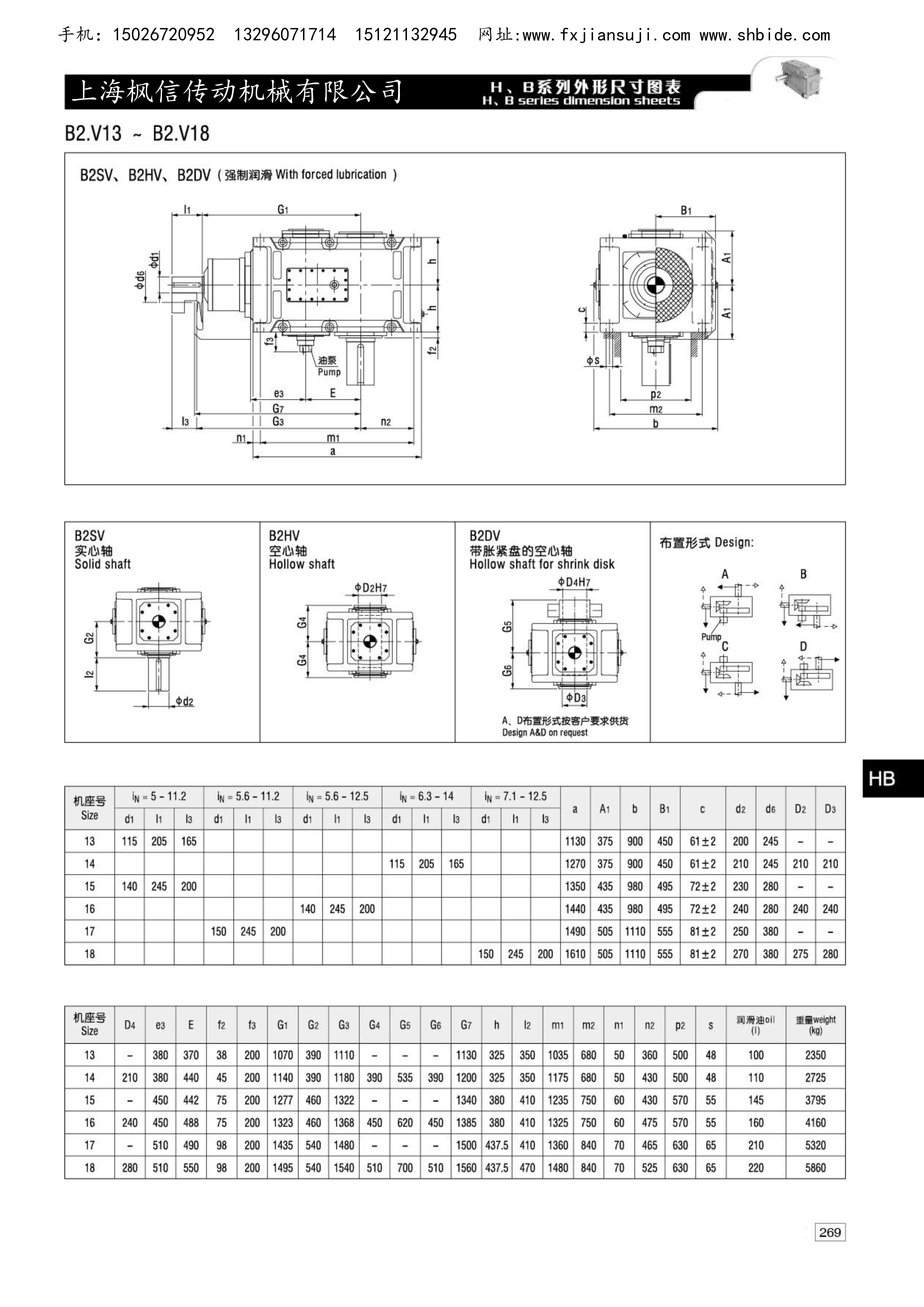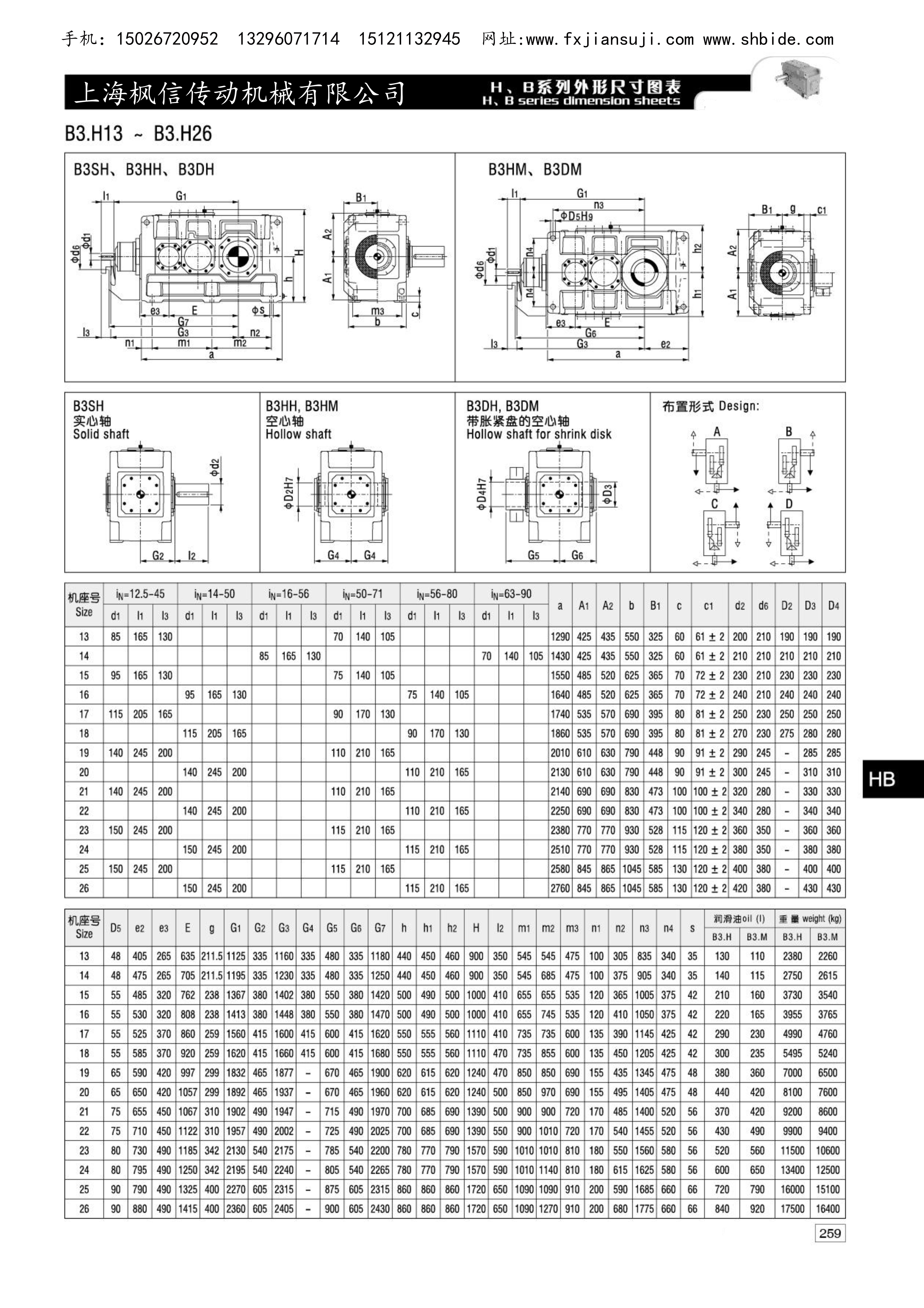 - H,B系列标准齿轮箱。 H系列布置形式实心轴,带收缩盘空心轴,带键空心轴