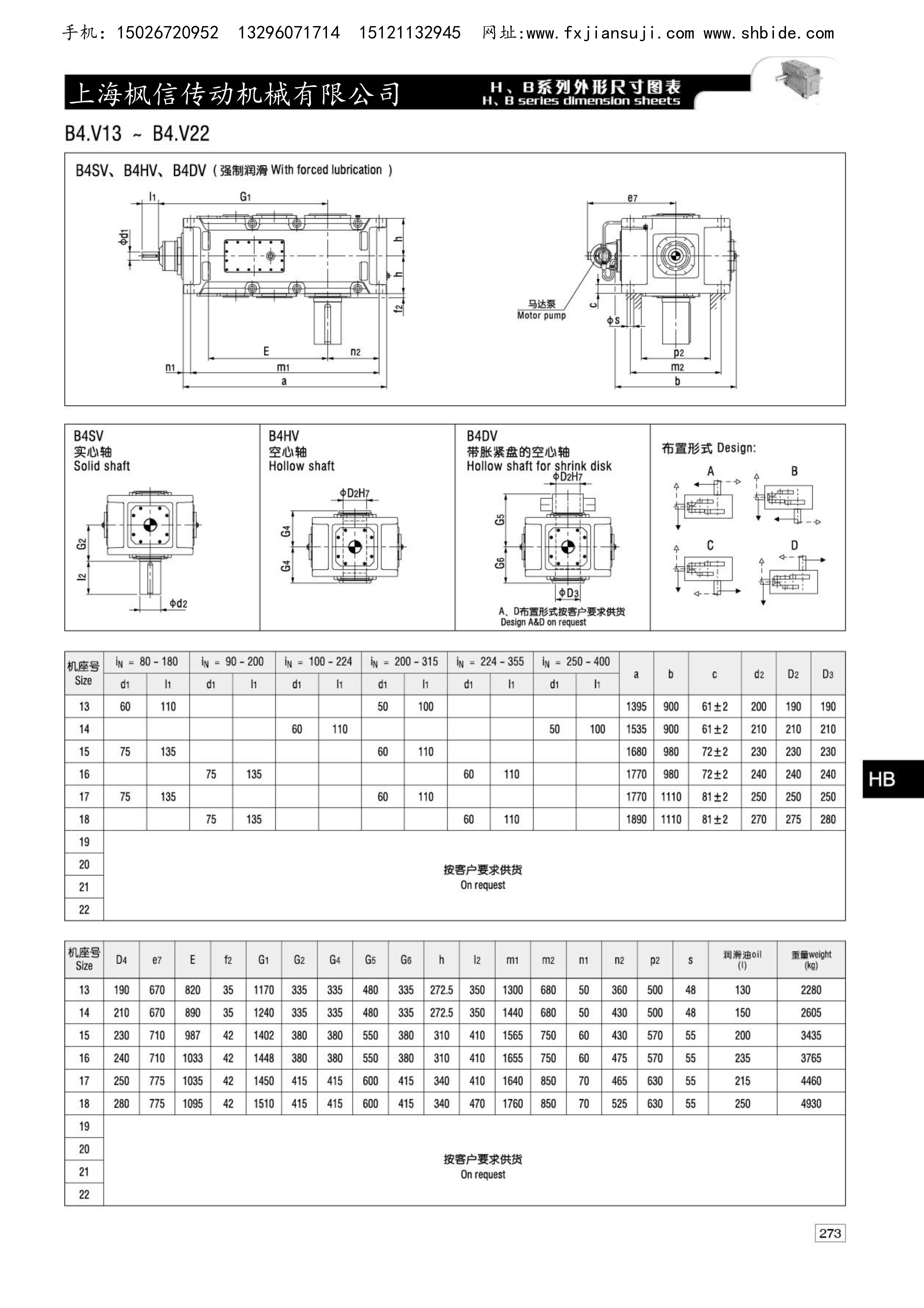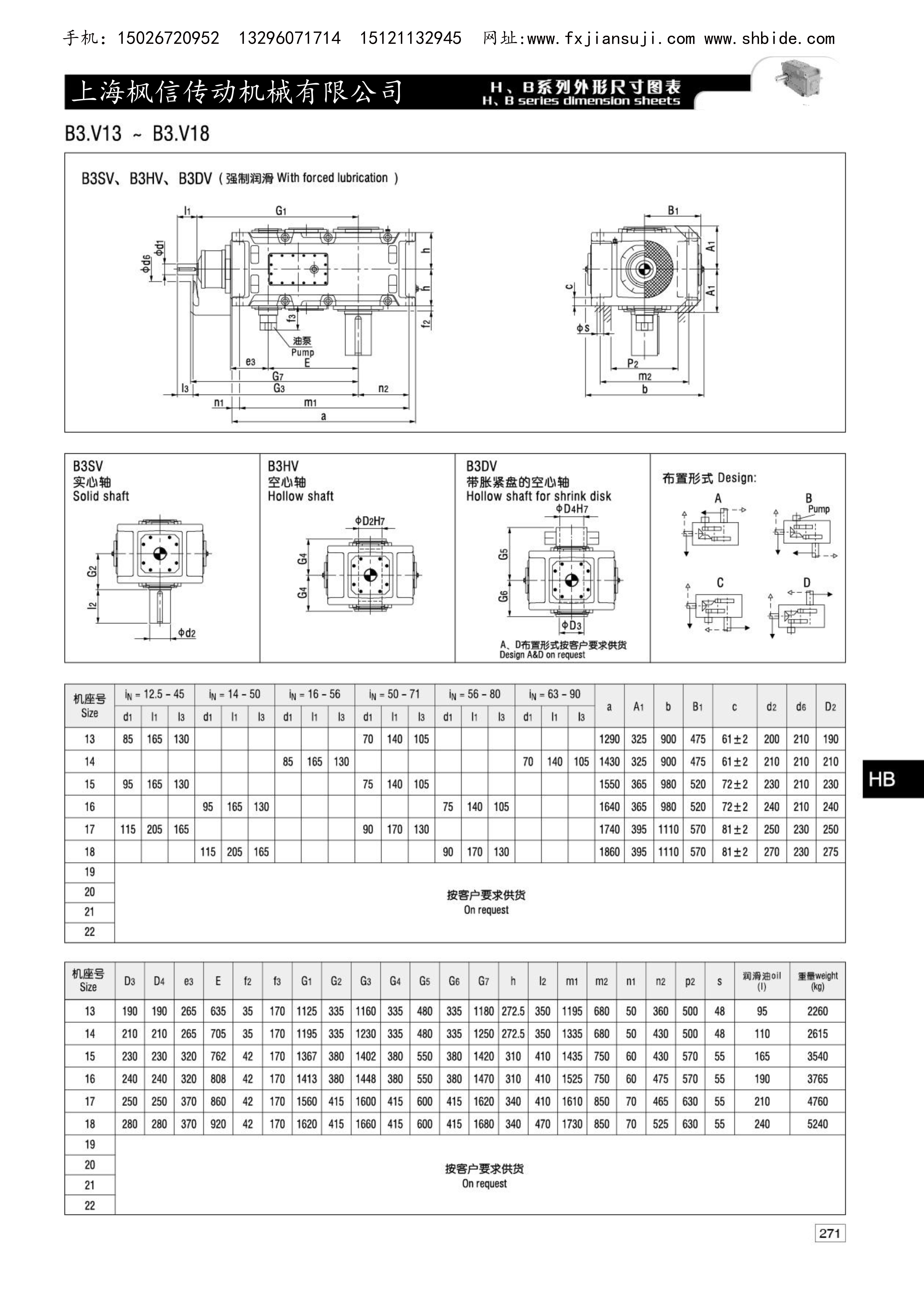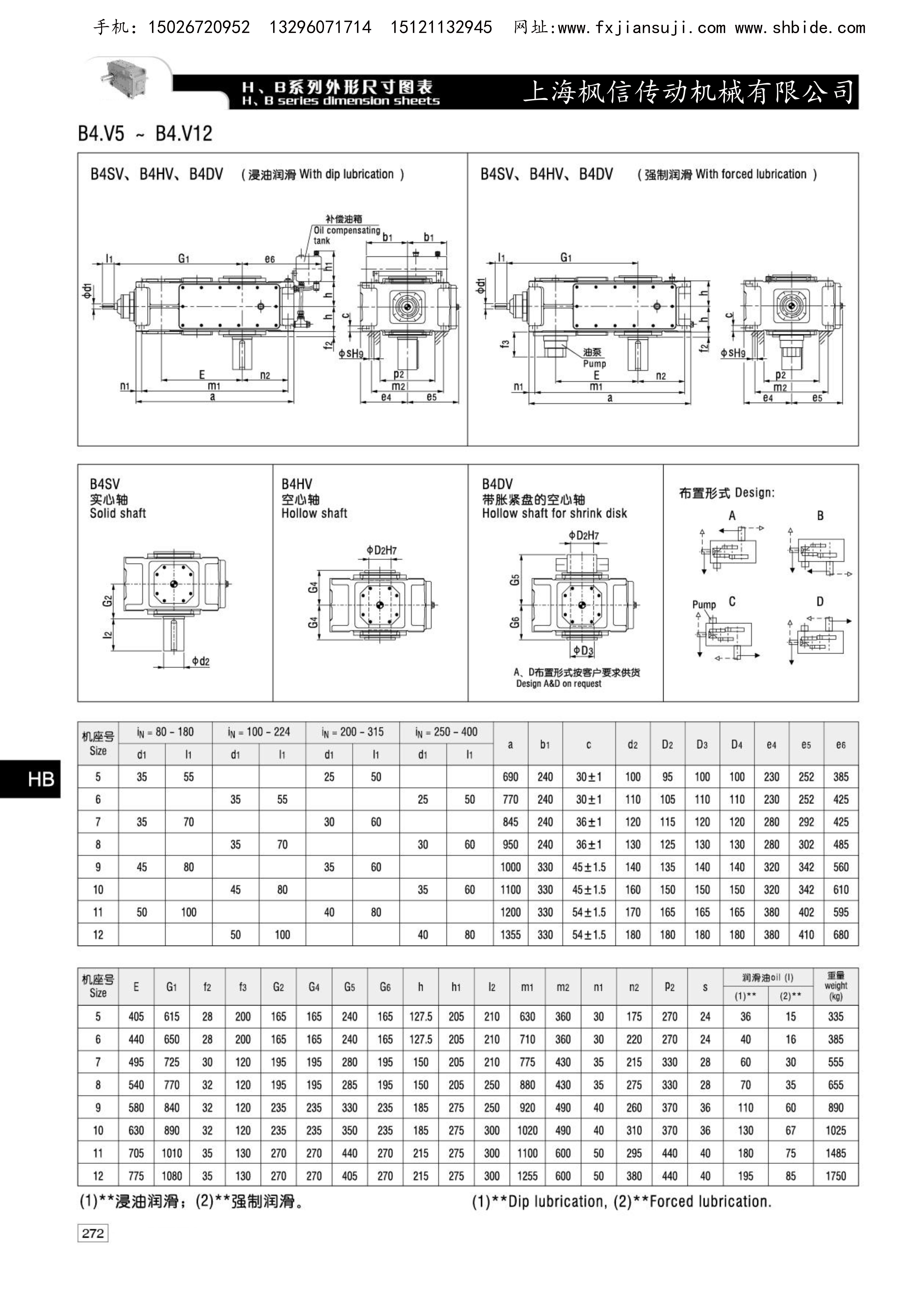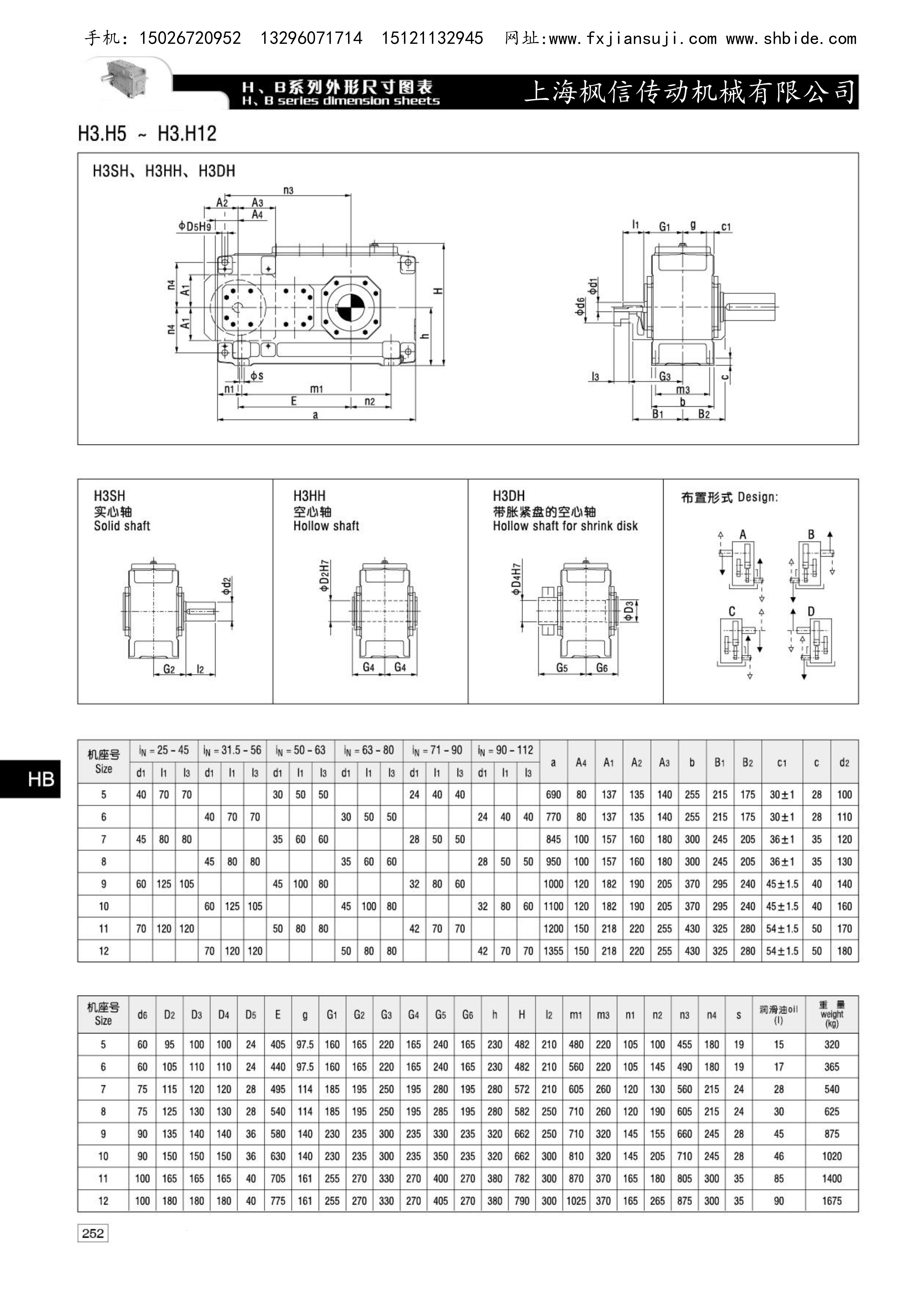 - H,B系列标准齿轮箱。 H系列布置形式实心轴,带收缩盘空心轴,带键空心轴