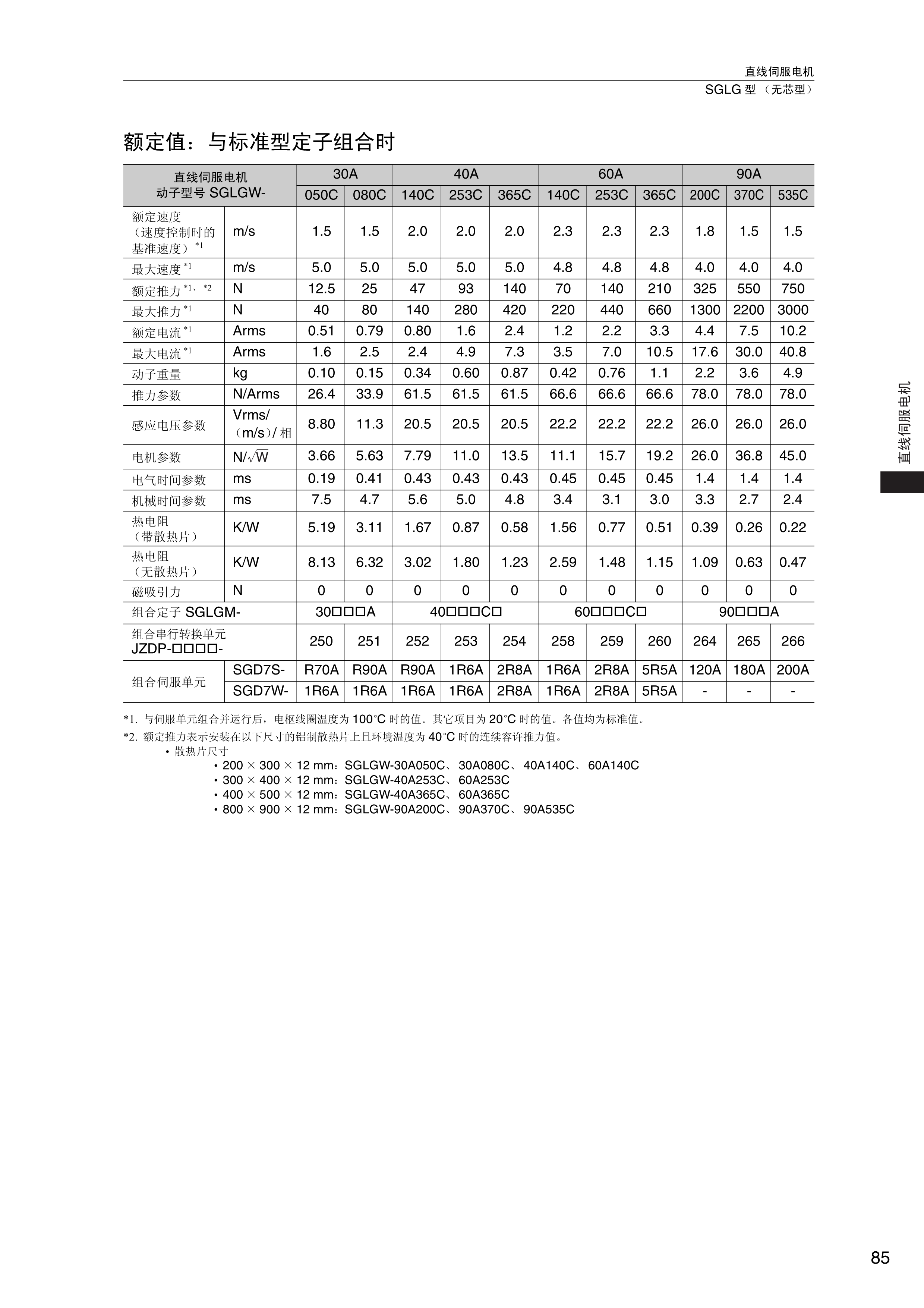 FX安川伺服电机 额定值;与标准型定子组合时,直线伺服电机SGLG型【无芯型】