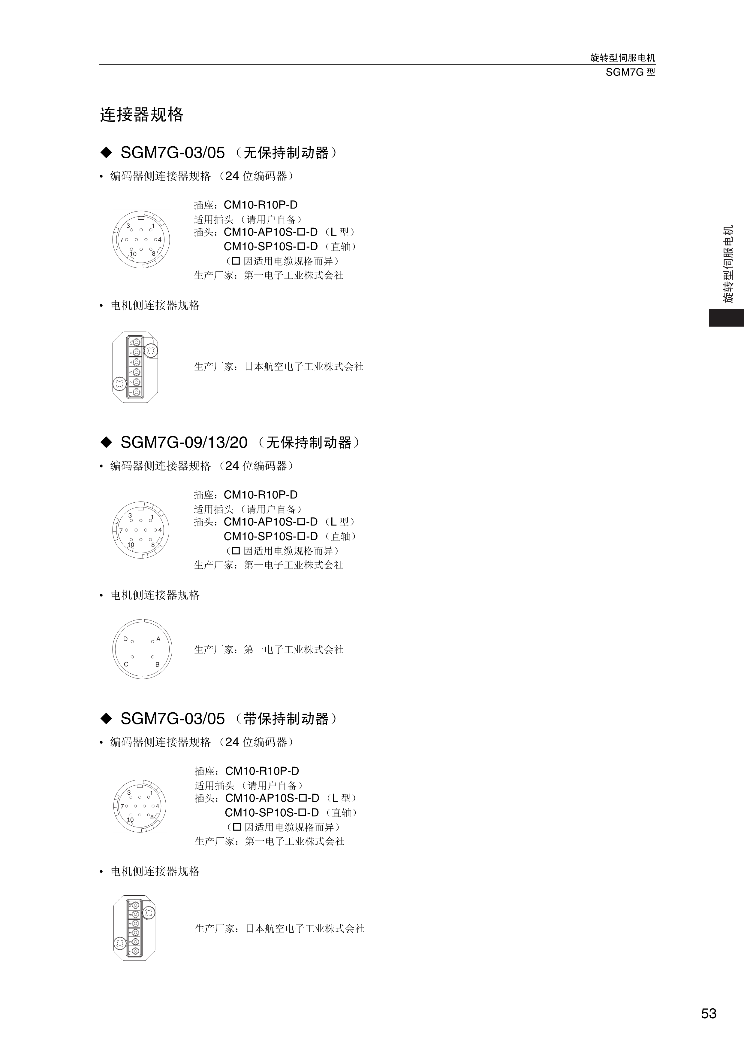 FX安川伺服电机 连接器规格,SGM7G-03/05【无保持制动器】,编码器侧连接器规格,电机侧连接器规格