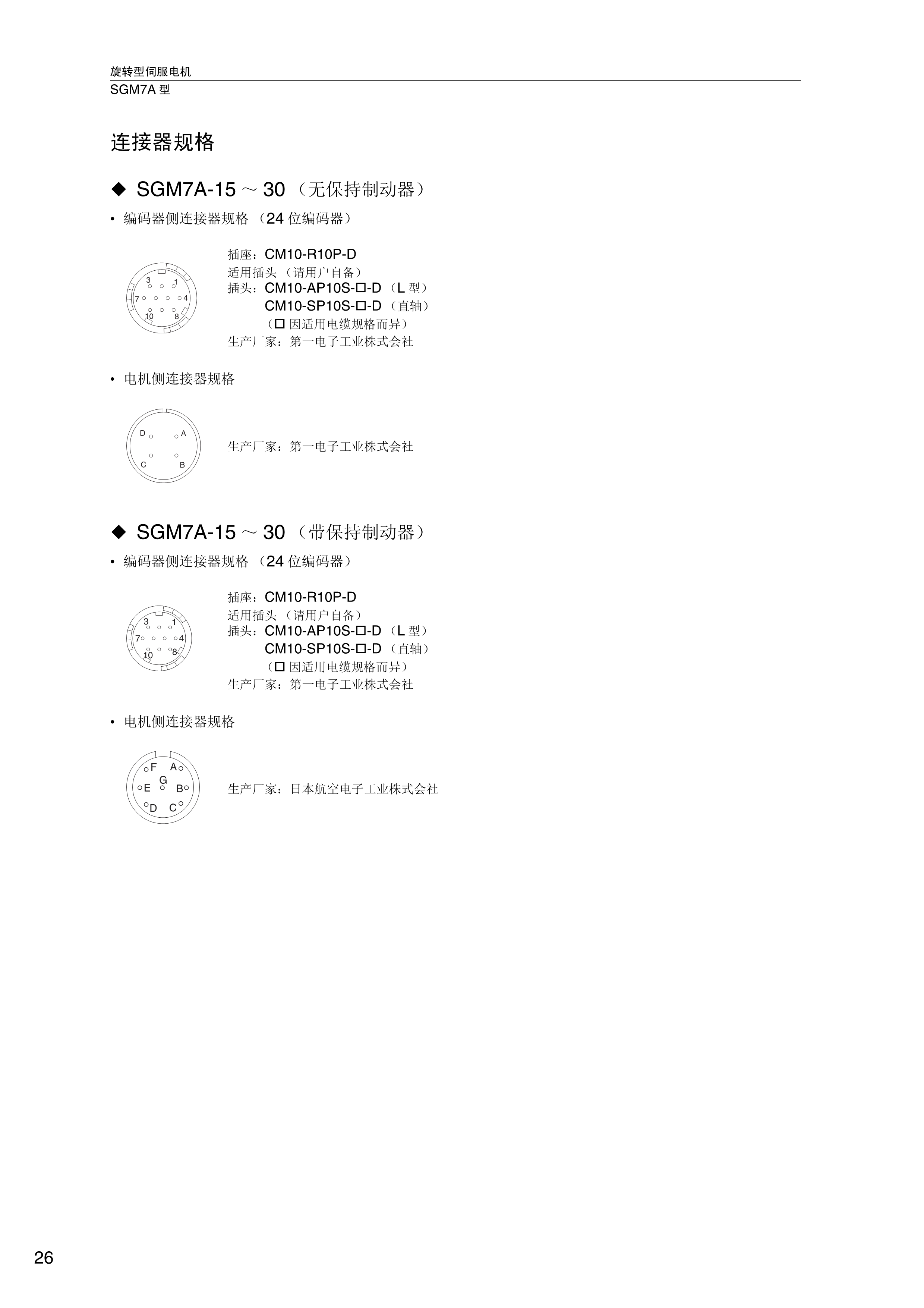 FX安川伺服电机 连接器规格SGM7A-15到30【无保持制动器】,编码器侧连接器规格,电机侧连接器规格,编码器侧连接器规格,旋转型伺服电机SGM7A型