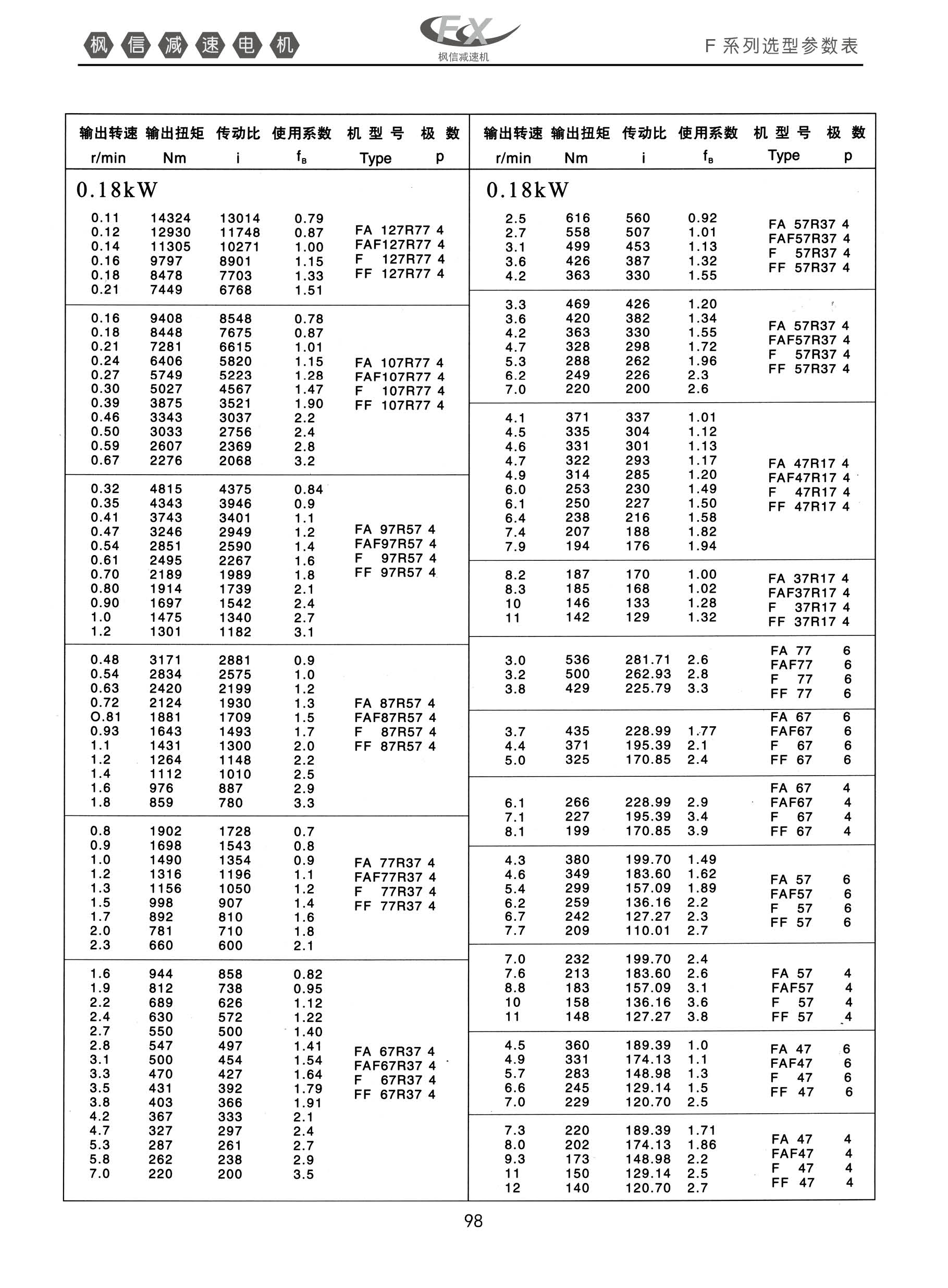 FXF系列平行轴斜齿轮减速机0.18KW.F系列选型参数表
