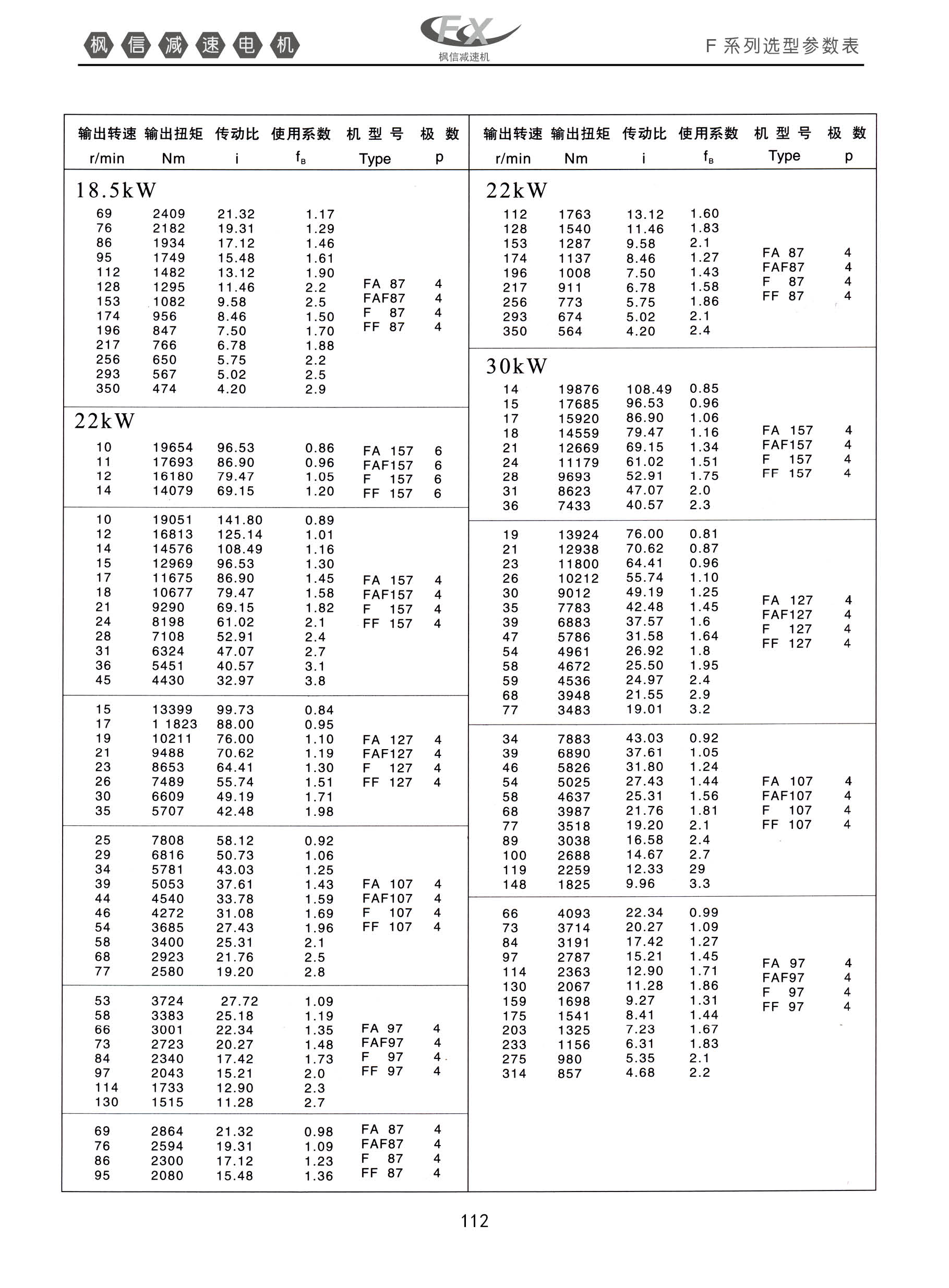 FXF系列平行轴斜齿轮减速机18.5KW.22KW.F系列选型参数表