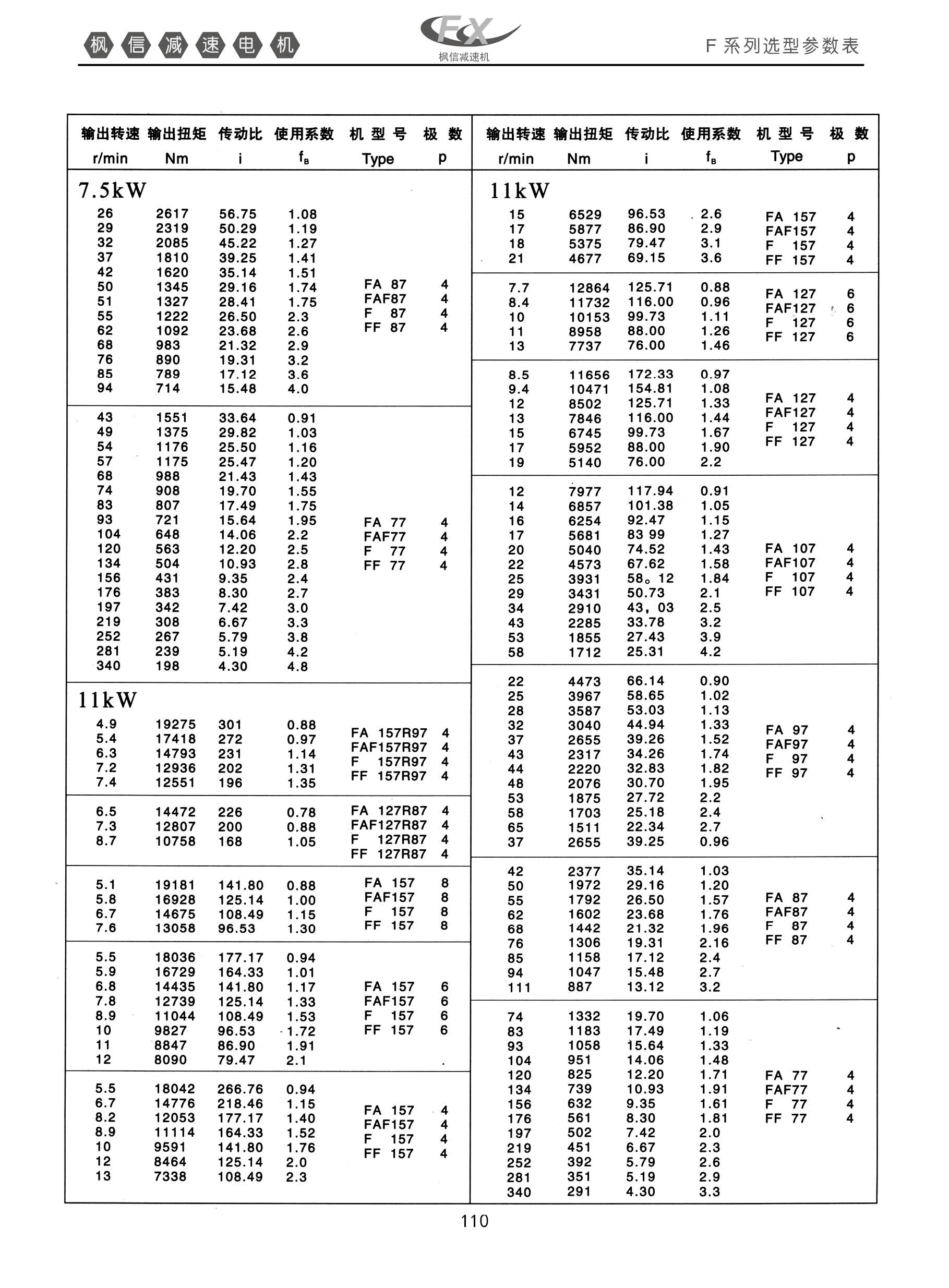 FXF系列平行轴斜齿轮减速机7.5KW.11KW.F系列选型参数表