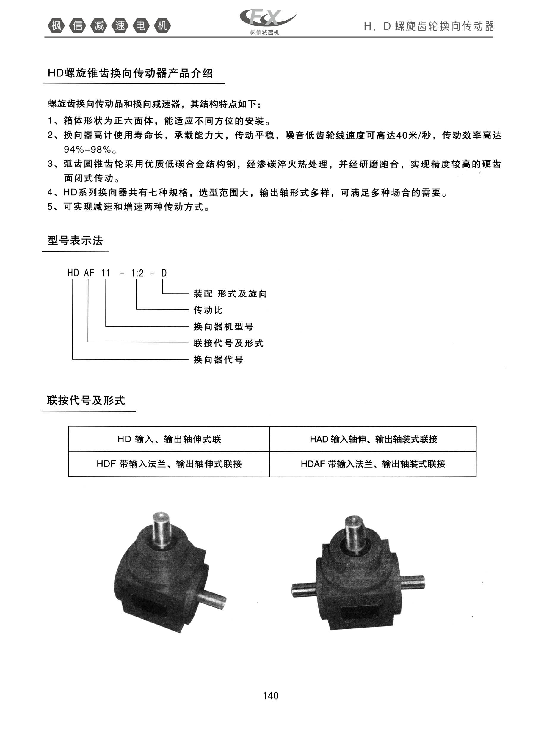 FXHD螺旋锥齿换向传动器。螺旋齿转换向传动品和换向减速器,其结构特点如下;1箱体形状为正六面体,能适应不同方位的安装。2,换向器高计使用寿命长,c承载能力大,传动平稳,噪音低齿轮线速度可高达40米/秒,传动效率高达94%-98%.3.弧齿圆锥齿轮采用优质低碳合金结构钢,经渗碳淬火热处理,并经研磨跑合,实现精度较高的硬齿面闭式传动。4.HD系列换向器共有七种规格,选型范围大,输出轴型式多样,可满足多种场合的需要。5,可实现减速和增速两种传动方式。 型号表示法,联按代号及形式