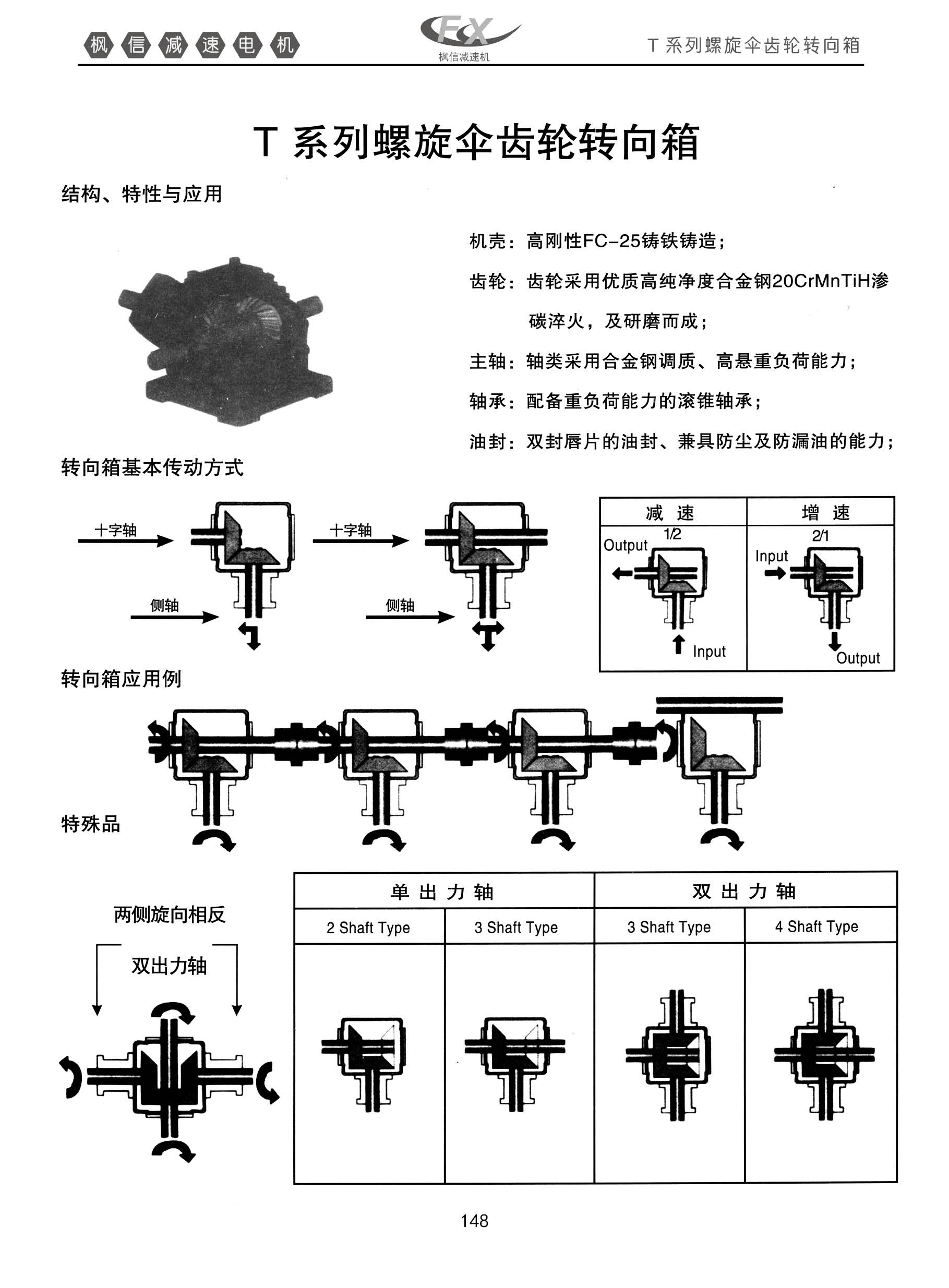 FXT系列螺旋伞齿轮转换箱。结构,特性与应用。机壳;高刚性FC-25铸铁铸造。齿轮;齿轮采用优质高纯净度合金20CrMnTiH渗碳淬火,及研墨而成。主轴;轴类采用合金钢调质,高悬重负荷能力。轴承;配备重负荷能力的滚锥轴承。油封;双封唇片的油封,兼具防尘及防漏油的能力。