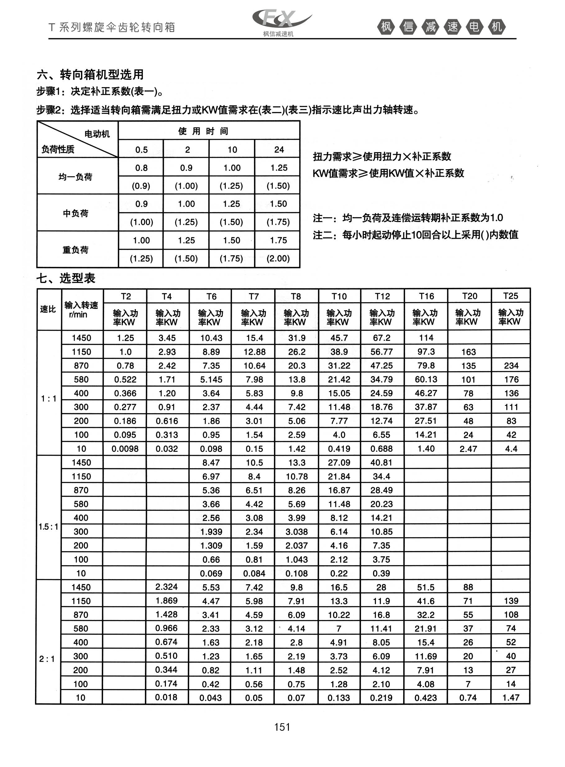 FXT系列螺旋伞齿轮转换箱。六,转向箱机型选用;步骤1;决定补正系数【表一】。步骤二;选择适当转向箱需满足扭力或KW值需求在【表二】【表三】指示速比声出力轴转速。七,选型表