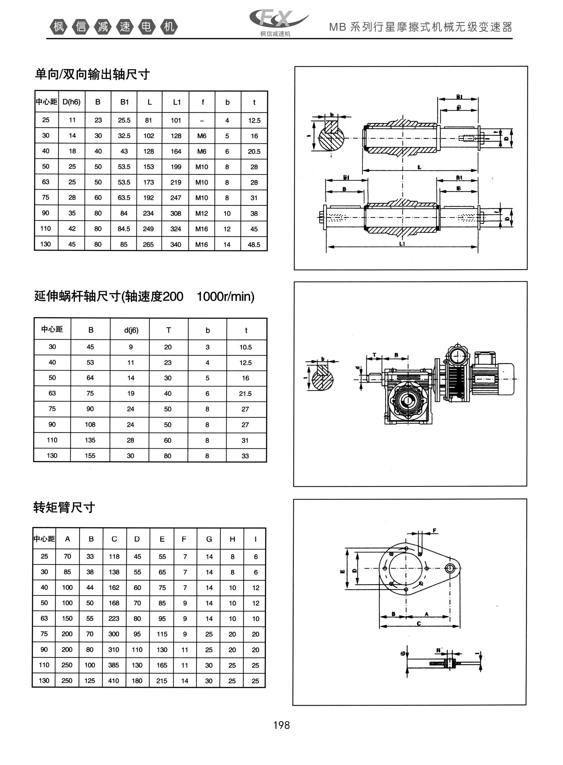 MB行星摩擦式机械无极变速器。单向/双向输出轴尺寸,延伸蜗轮轴尺寸【轴速度200 1000r/min】,转矩臂尺寸