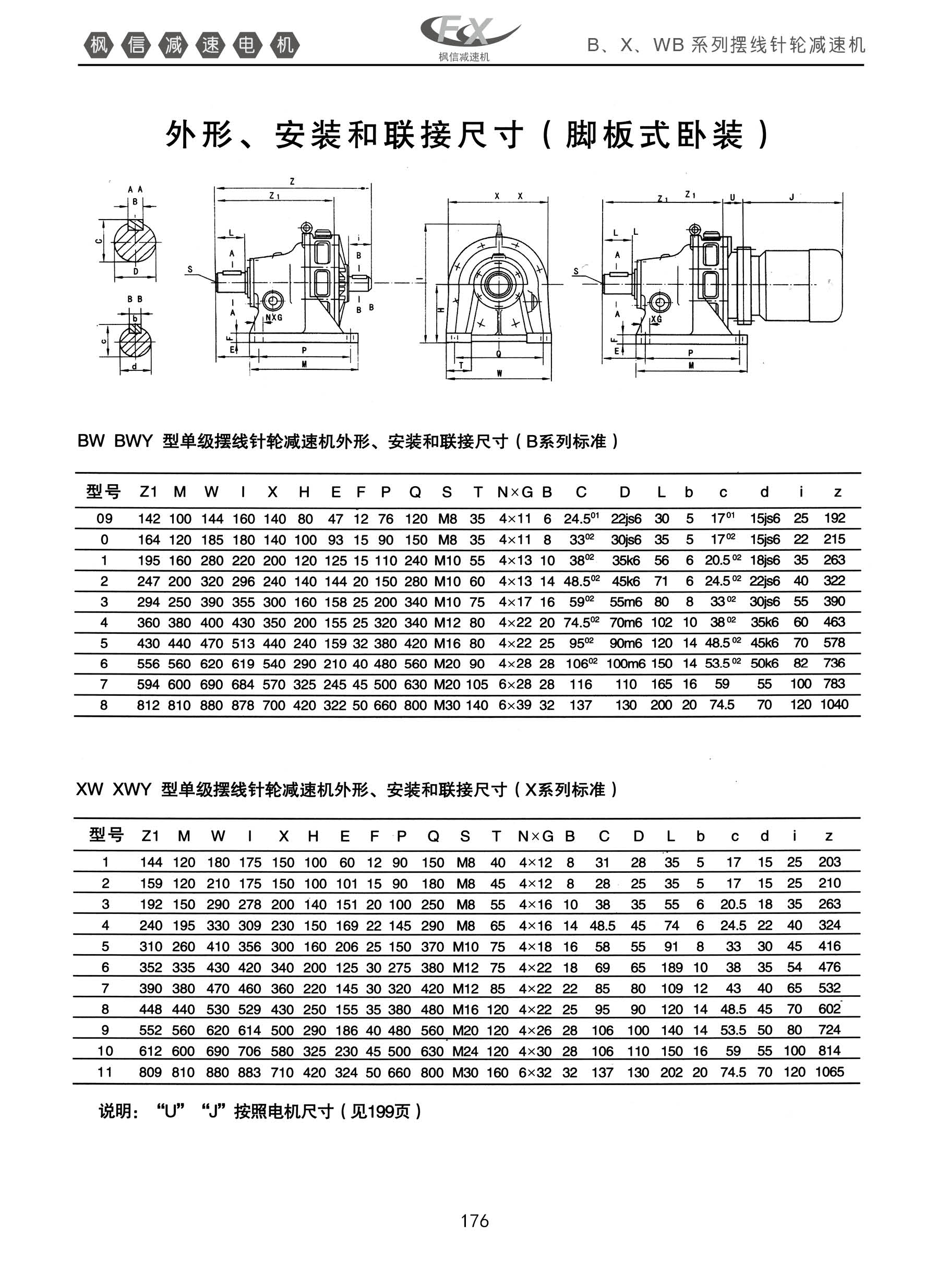 B.X.WB系列摆线针轮减速机外形,安装和联接尺寸【脚板式卧装】,BW BWY 型单极摆线针轮减速机外形,安装和联接尺寸【B系列标准】XW XWY 型单极摆线针轮减速机外形,安装和联接尺寸【X系列标准】