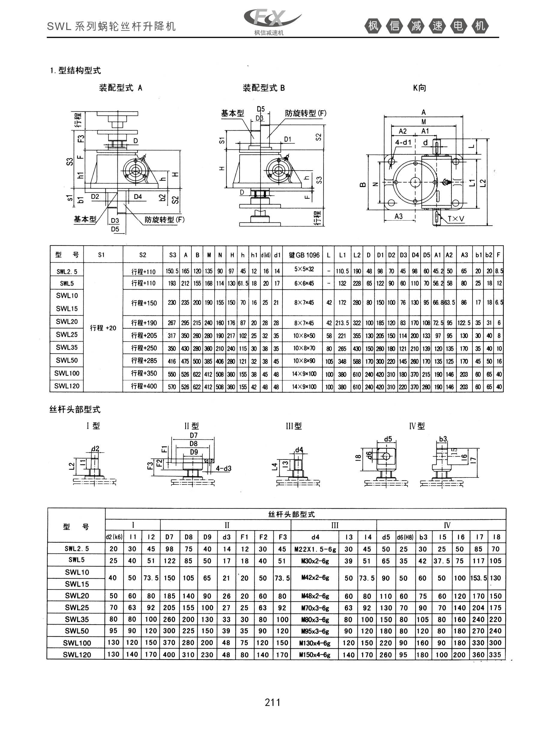 SWL系列蜗轮丝杆升降机。1,型结构型式,装配型式A,装配型式B,丝杆头部型式