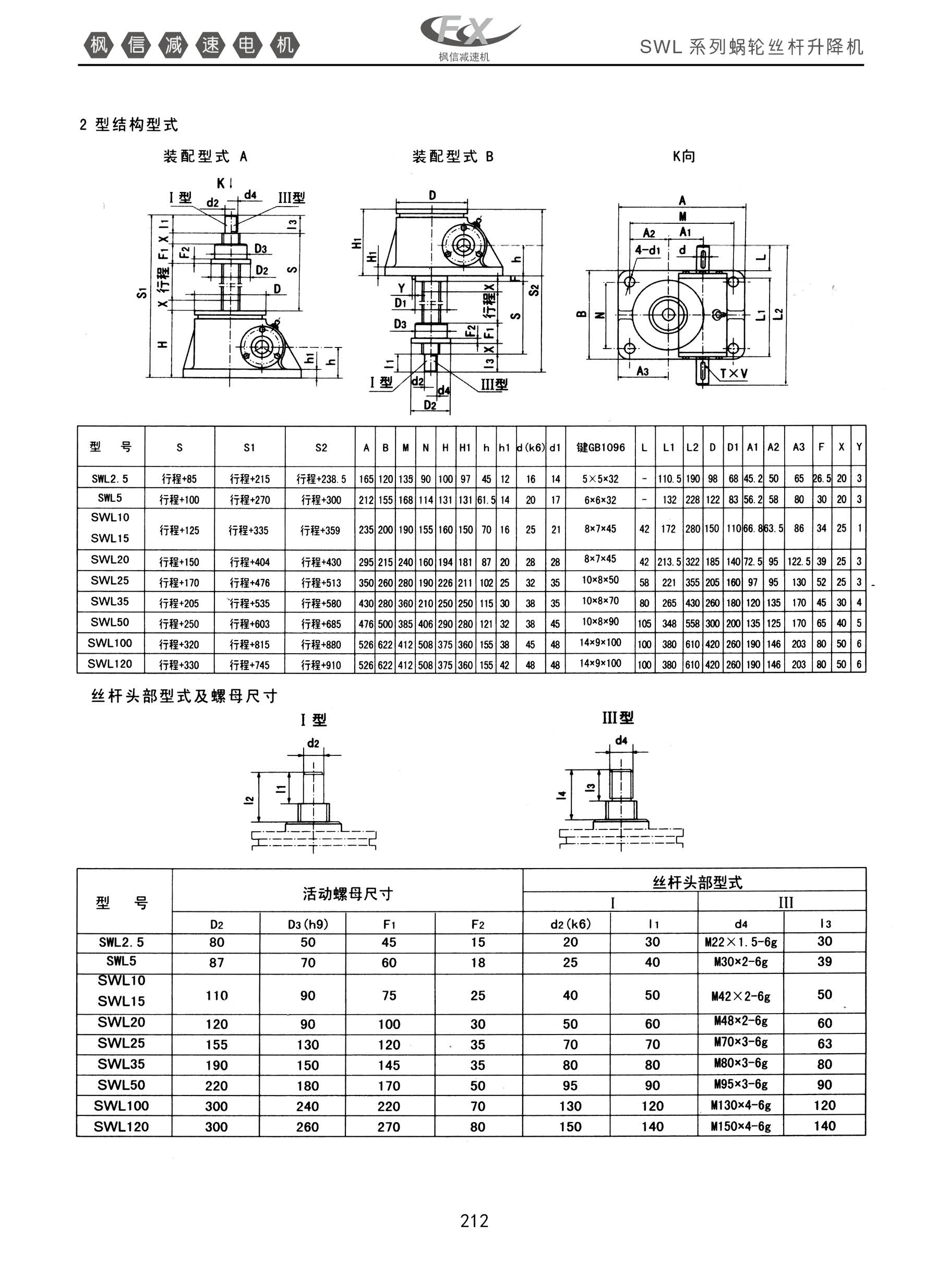 SWL系列蜗轮丝杆升降机。2,型结构型式;装配型式A,装配型式B,丝杆头部型式及螺母尺寸