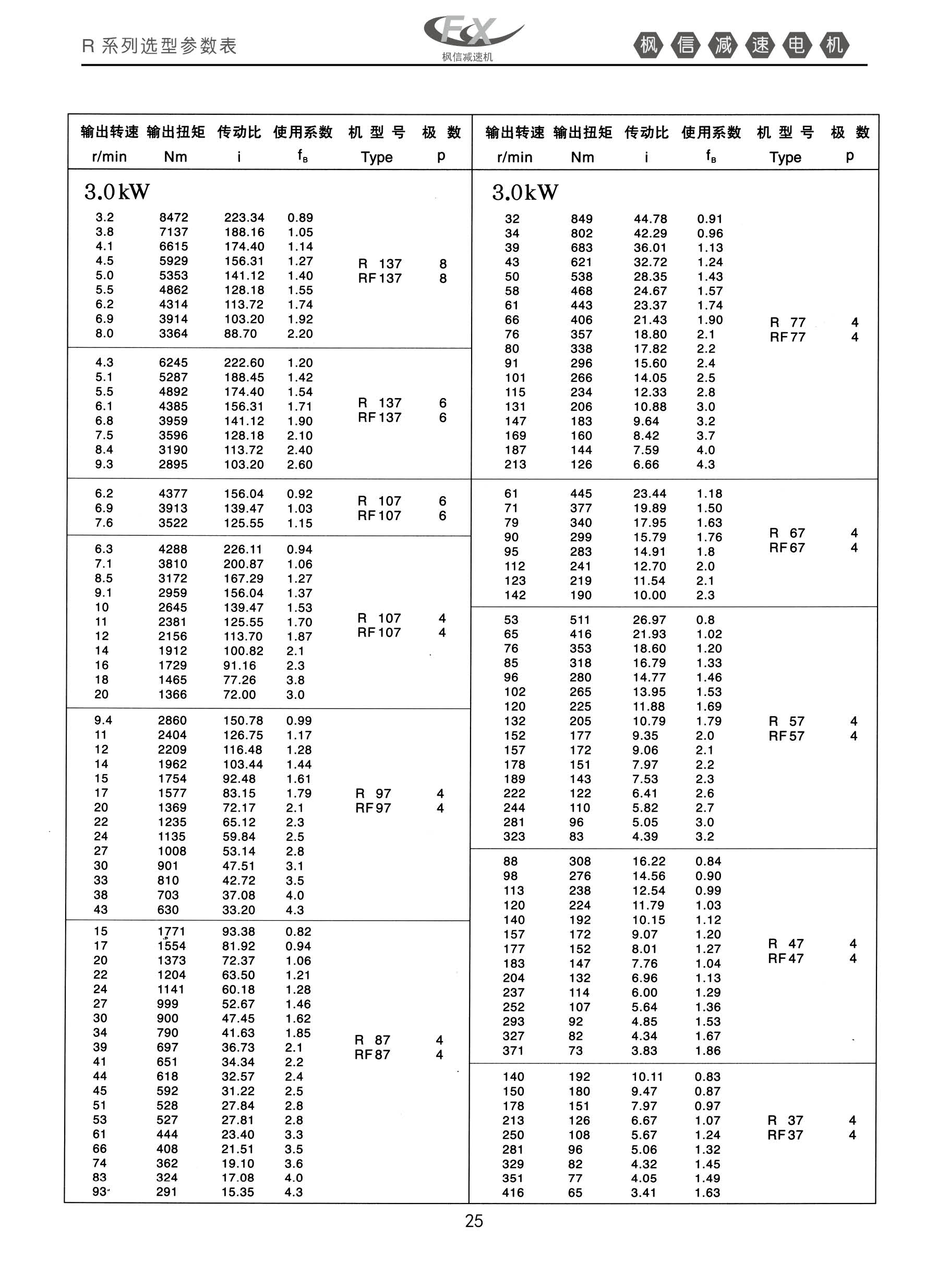 FXR系列斜齿轮硬齿面减速机3.0KW。选型表枫信减速机