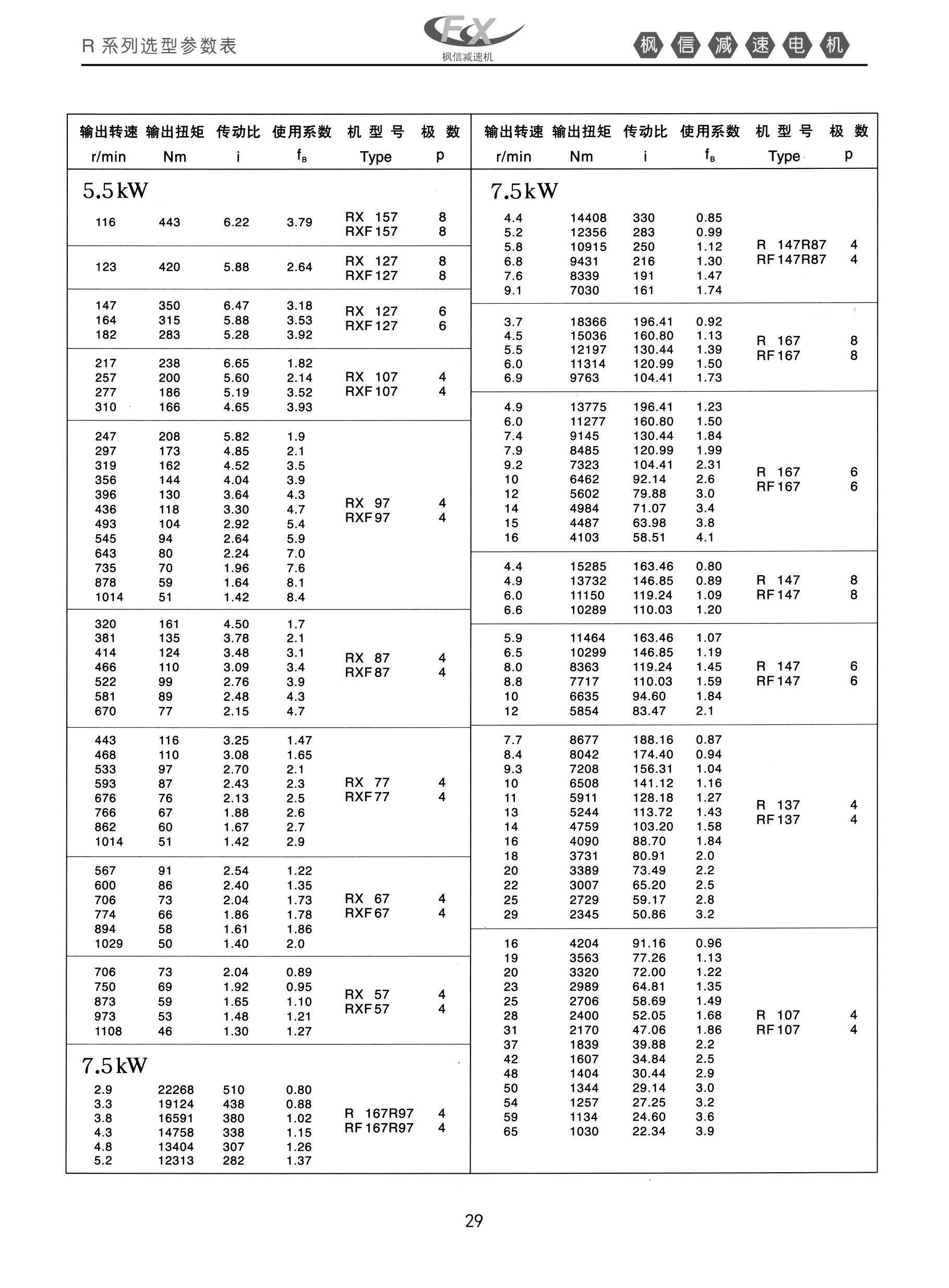FXR系列斜齿轮硬齿面减速机5.5KW。7.5kw选型表枫信减速机
