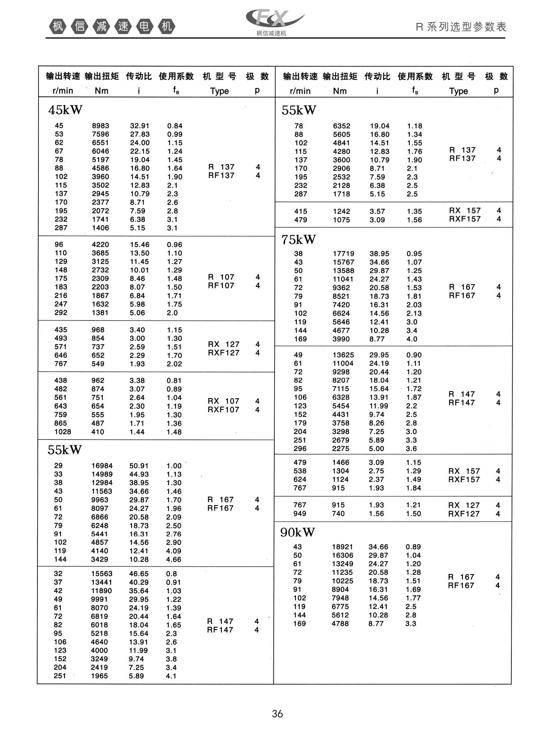 FXR系列斜齿轮硬齿面减速机45KW。55kw选型表枫信减速机