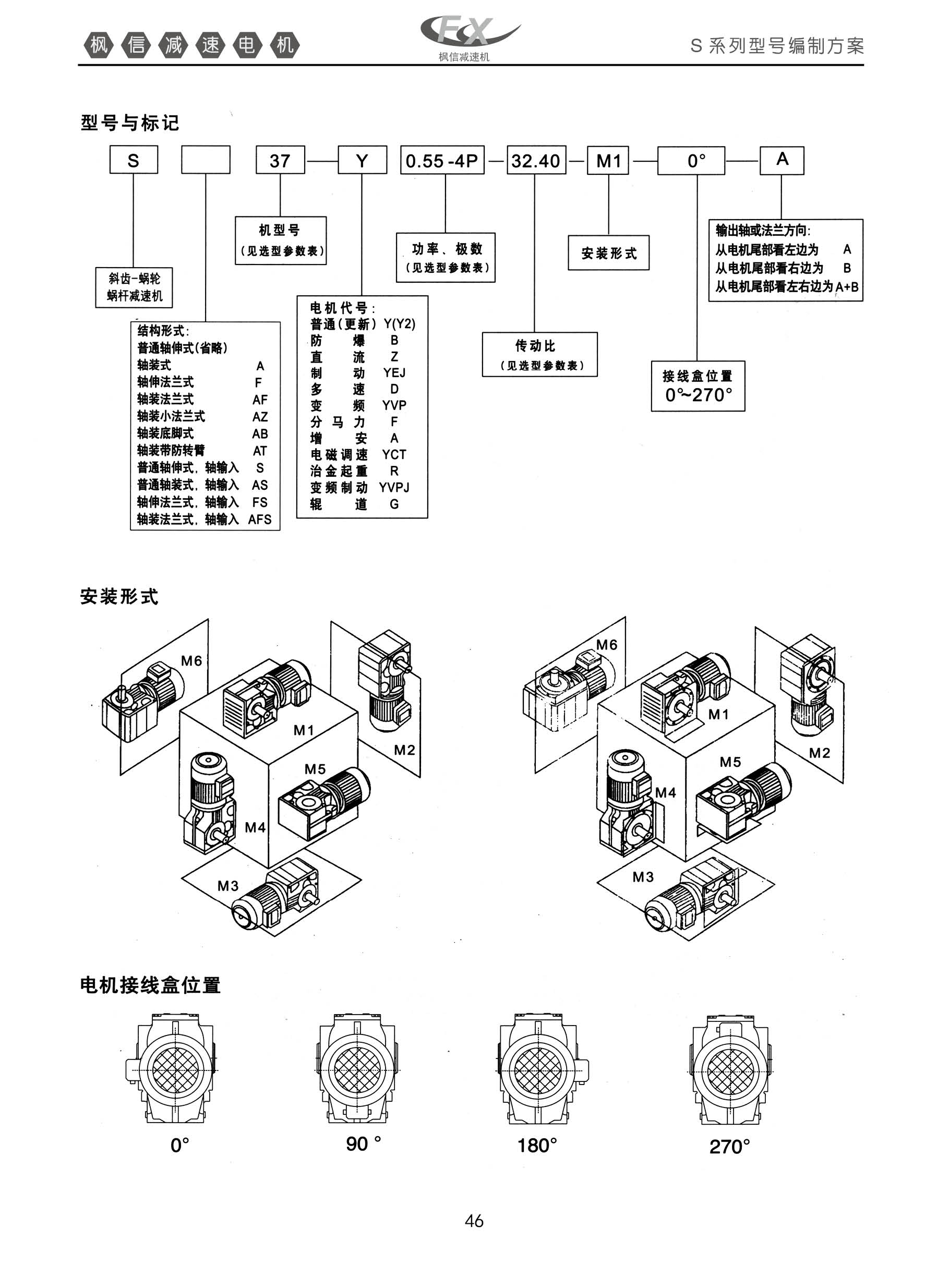 FXR系列斜齿-蜗轮蜗杆减速机。型号与标记,安装形式,电机接线盒位置