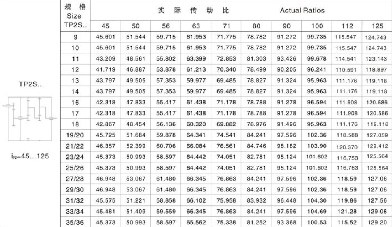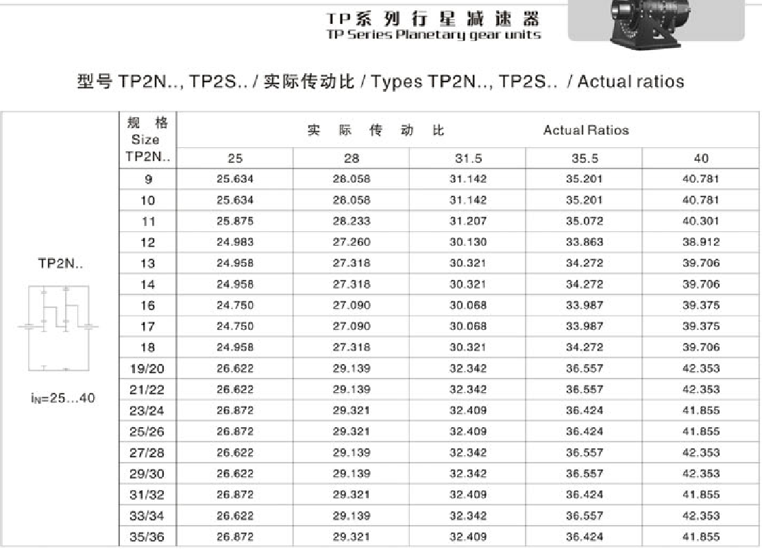 FXTP型号 TP2N.., TP2S../ 实际传动比 /Types TP2N.., TP2S.. / Actual ratios系列大功率行星齿轮减速机