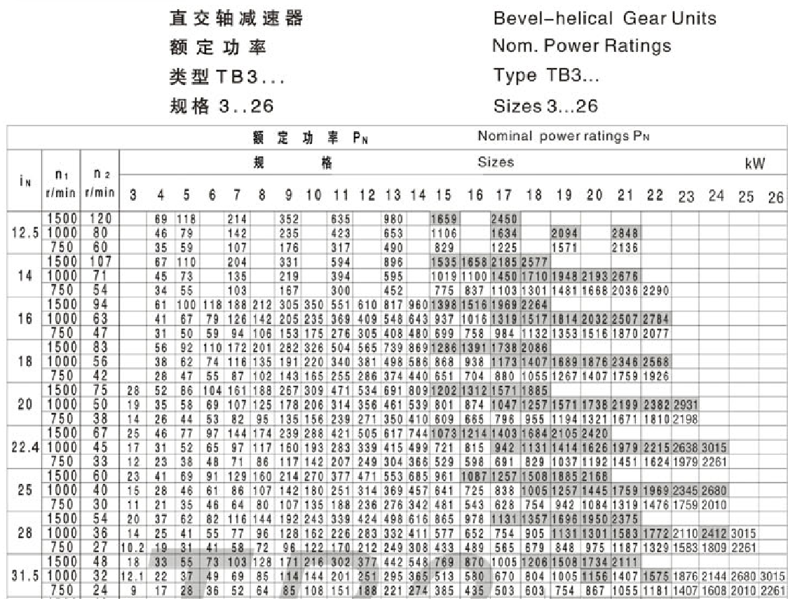 FXHB直交轴减速机 Bevel -helical Gear Units 额定功率 Nom . Power Ratings 类型 TB3... Type TB3... Sizes 3...26系列大功率工业齿轮箱