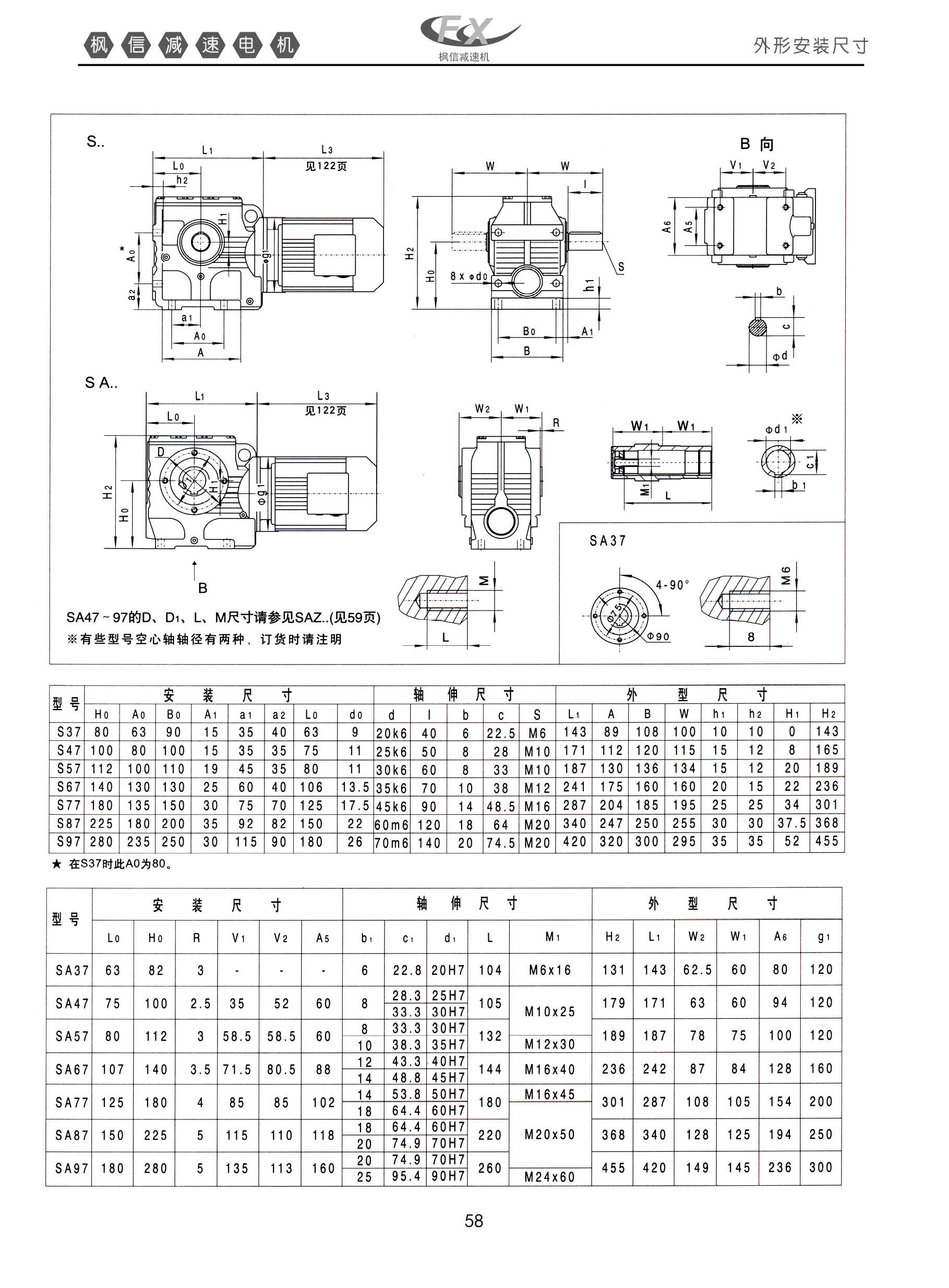 FXS系列斜齿-蜗轮蜗杆减速机。外形安装尺寸。SA型