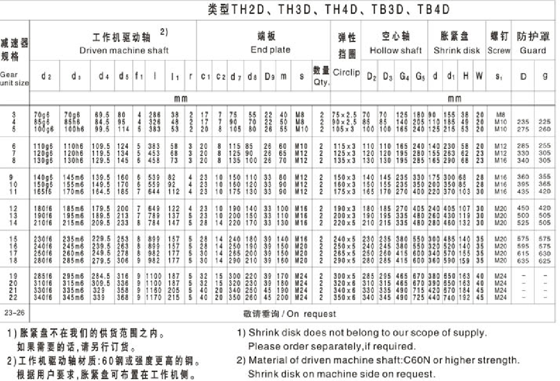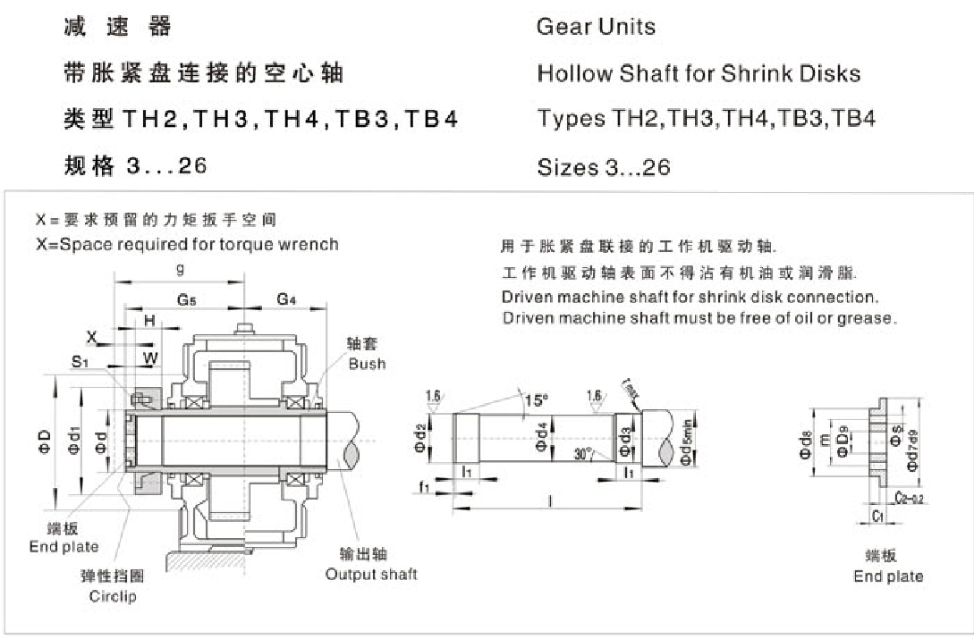 FXHB减速器 Gear Units,带胀紧盘连接的空心轴 Hollow Shaft for Shrink Disks 规格 3...26 Sizes 3...26 类型 TH2,TH3,TH4,TB3,TB4 ,Types TH4,TB3,TB4,系列大功率工业齿轮箱