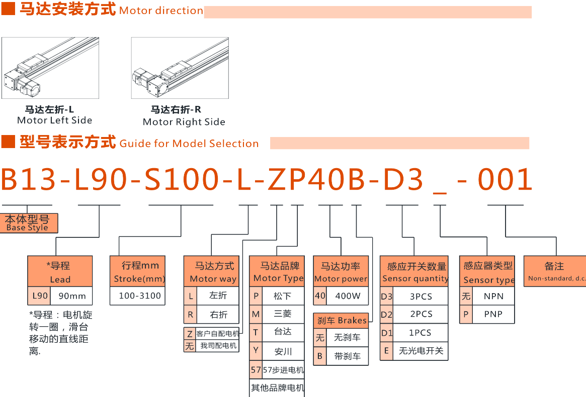 FX直线模组B13 同步带驱动 马达安装方式,型号表示方式