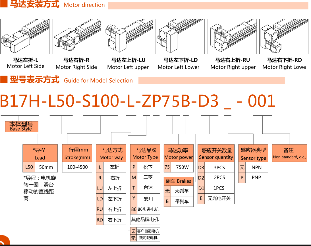 FX直线模组 B17H同步带驱动,马达安装方式,型号表示方式
