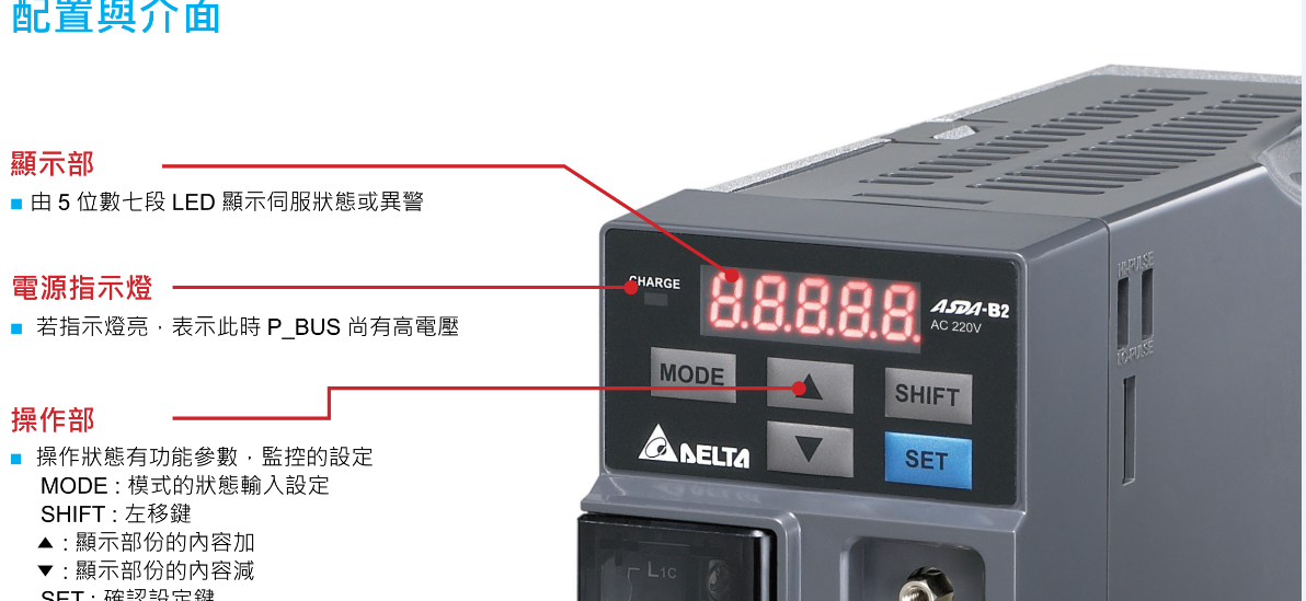 FX台达伺服电机配置介面,指示部,电源指示灯,操作部,电源主控制回路,伺服马达输出,回生电阻,接地端