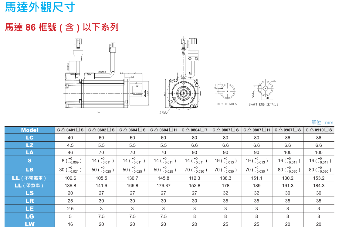 FX台达伺服电机 马达外形尺寸,马达 86 框含以下系列