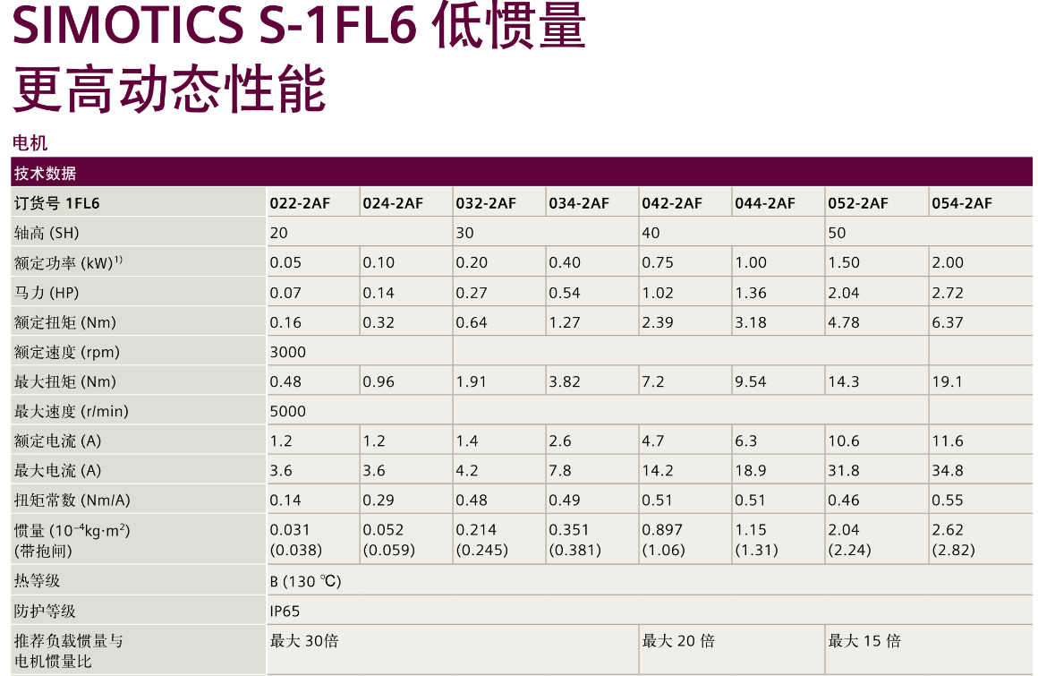 FX西门子伺服电机 SIMOTICS S-1FL6 低惯量,更高动态性能,技术数据,抱闸规格