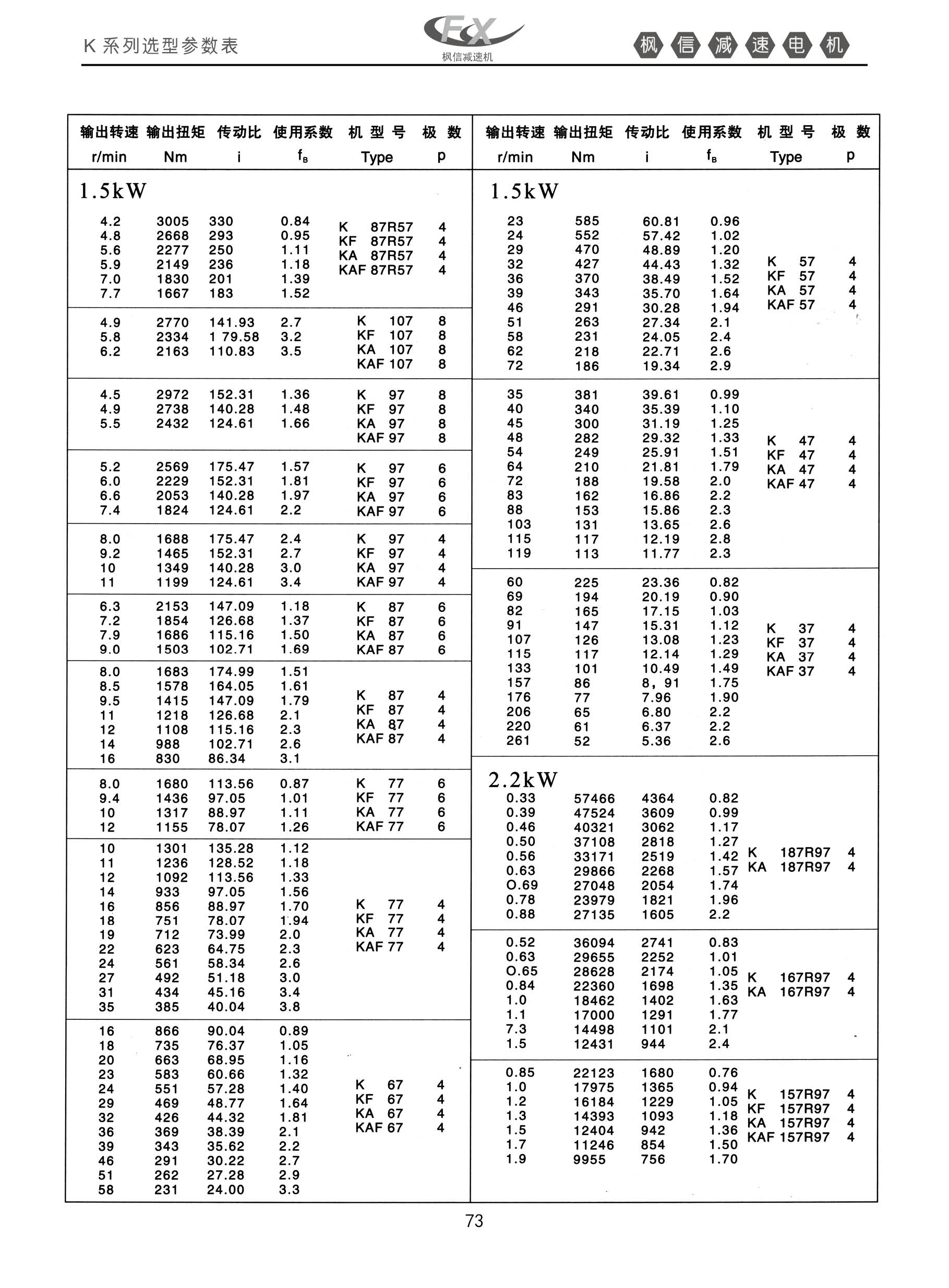 FXK系列螺旋锥齿轮减速机1.5KW.K系列选型参数表