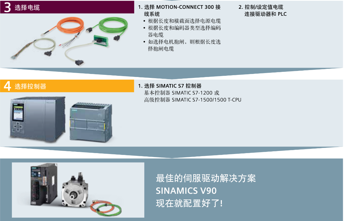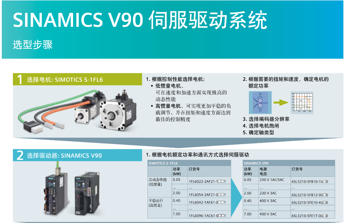 FX西门子伺服电机 SINAMICS V90 伺服驱动系统,选型步骤;1,选择电机;SIMOTICS S-1FL6 2,选择驱动器;SINAMICS V90 3,选择电缆 4,选择控制器