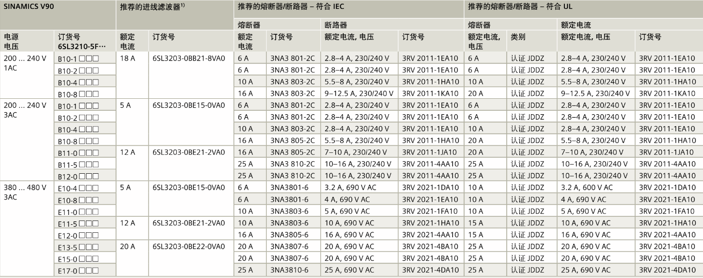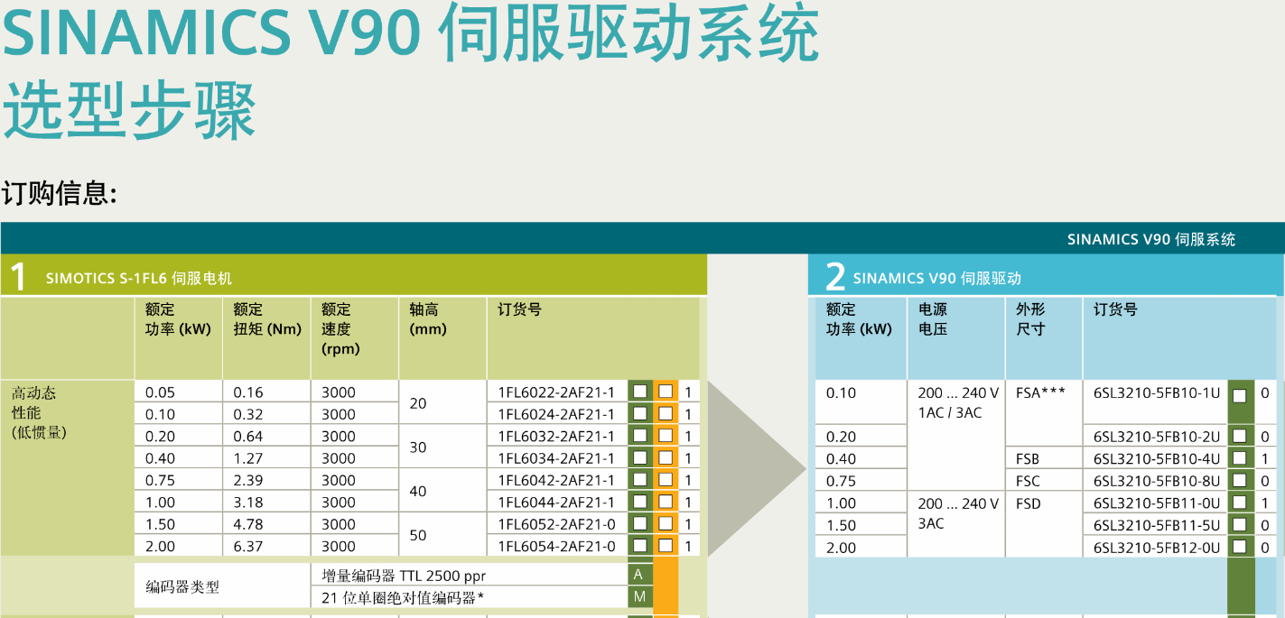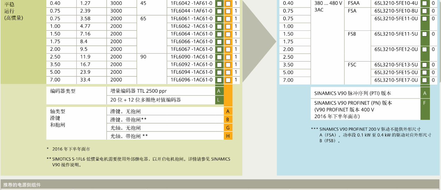 FX西门子伺服电机 SINAMICS V90 伺服驱动系统选型步骤,订购信息,SIMOTICS S-1FL6伺服电机,推荐的电源侧组件