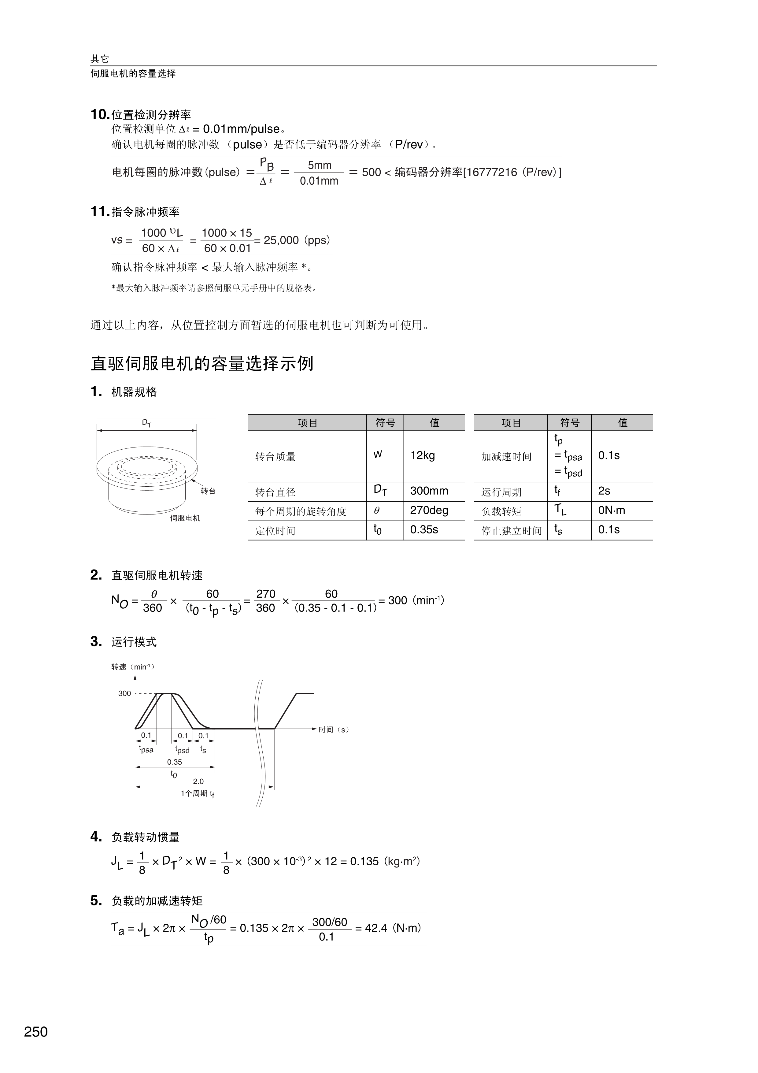 FX安川伺服电机 10,位置检测分辨率 11,指令脉冲频率 直驱伺服机容量的选择示例 1,机器规格 2,直驱伺服电机转速 3,运行模式4,负载转动惯量 5,负载的加速转矩