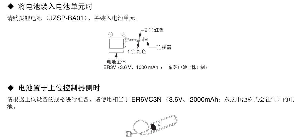 FX安川伺服电机 电池【带绝对值编码器的电池用】 将电池装入电池单元时,电池置于上位控制器侧时