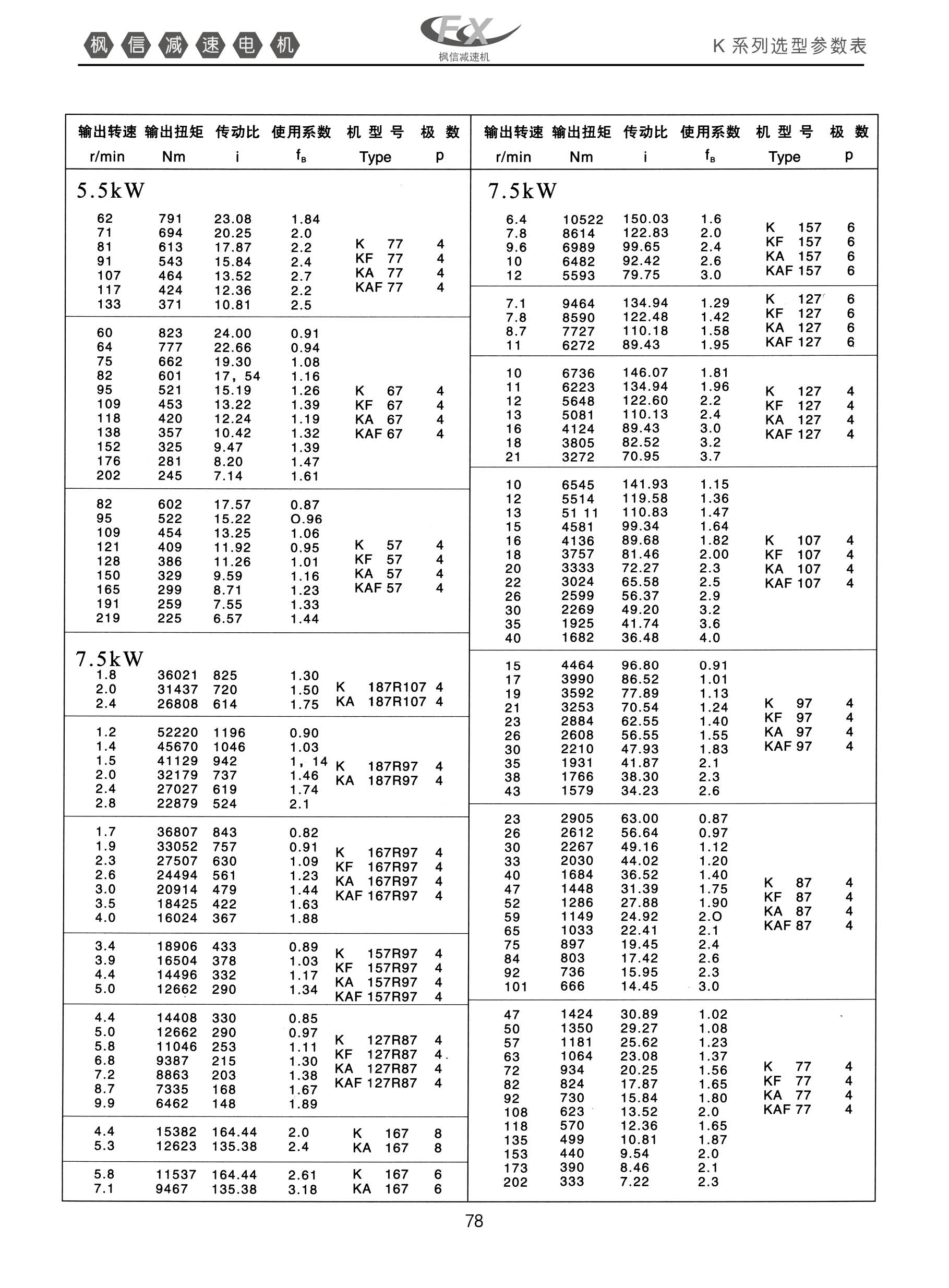 FXK系列螺旋锥齿轮减速机5.5KW.7.5KW.K系列选型参数表