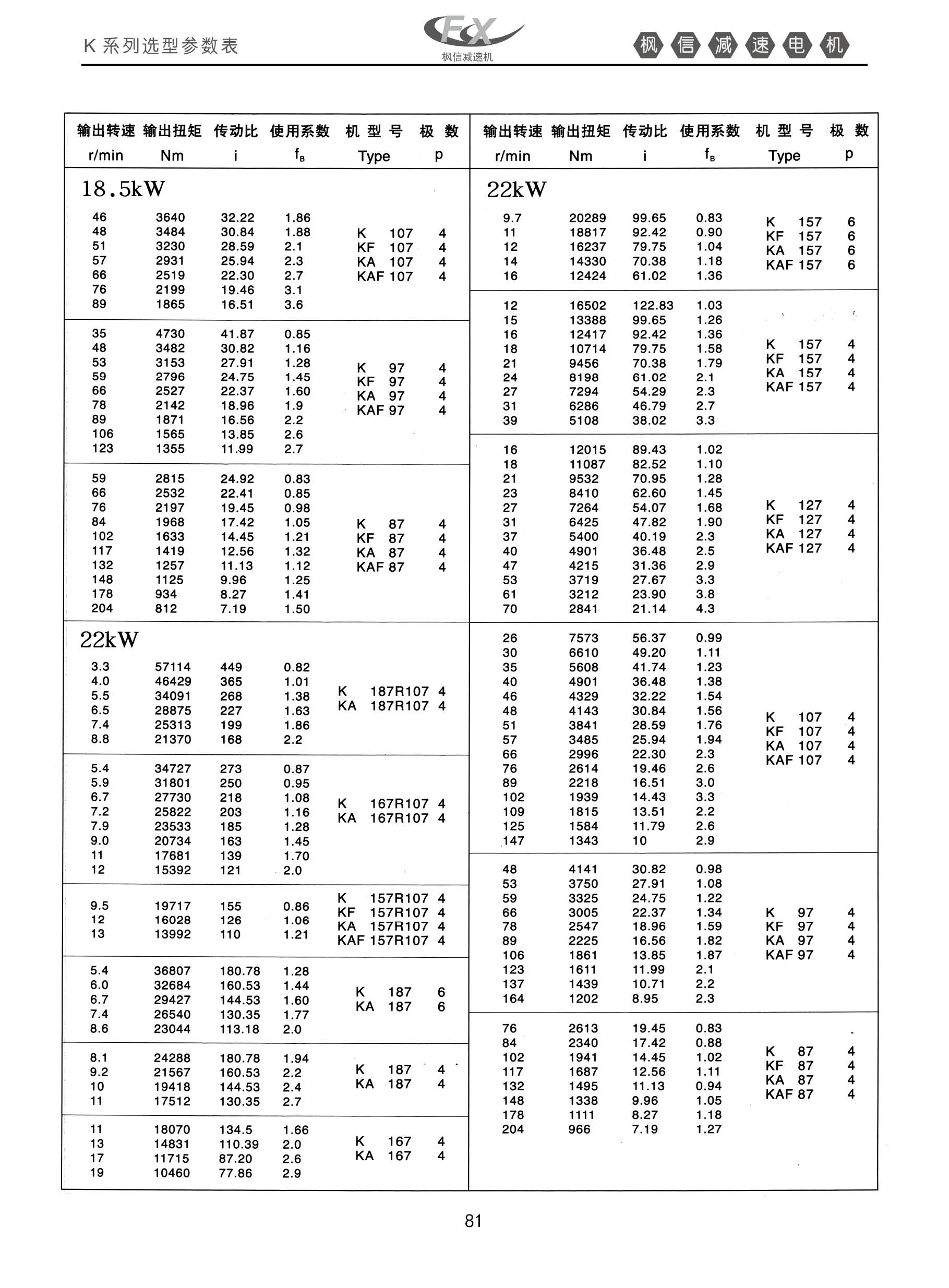 FXK系列螺旋锥齿轮减速机18.5KW.22KW.K系列选型参数表